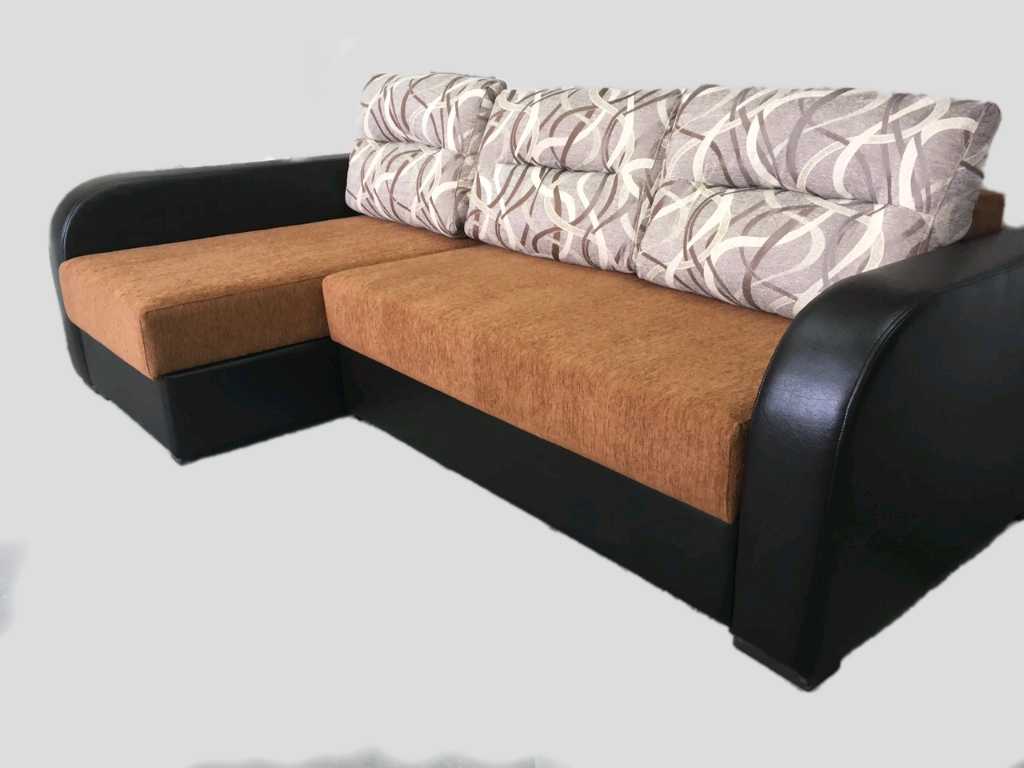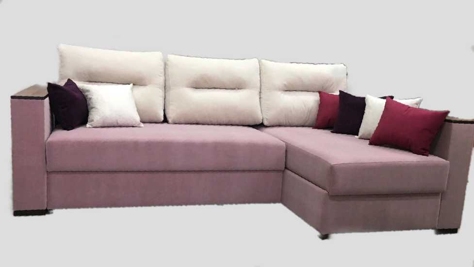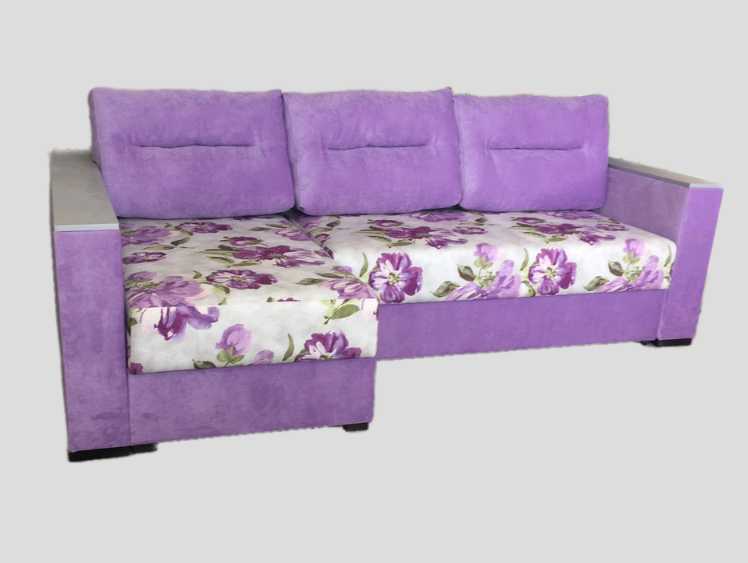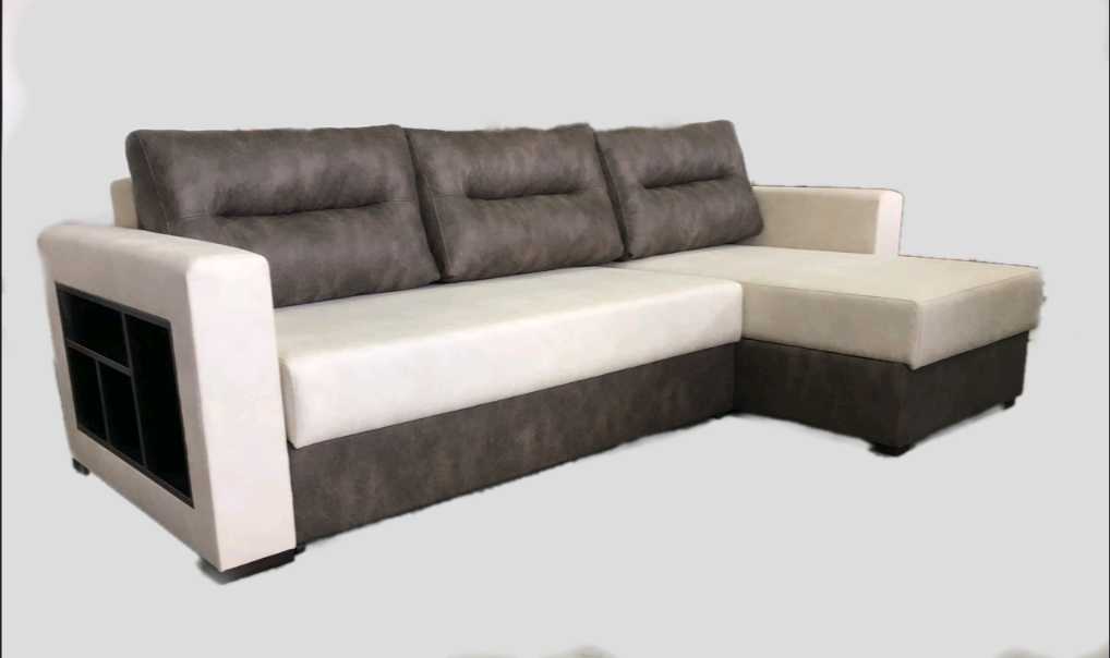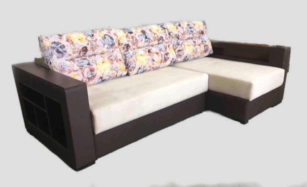 Современный стиль. Полки в боковинах и широкие подлокотники с деревянными вставками