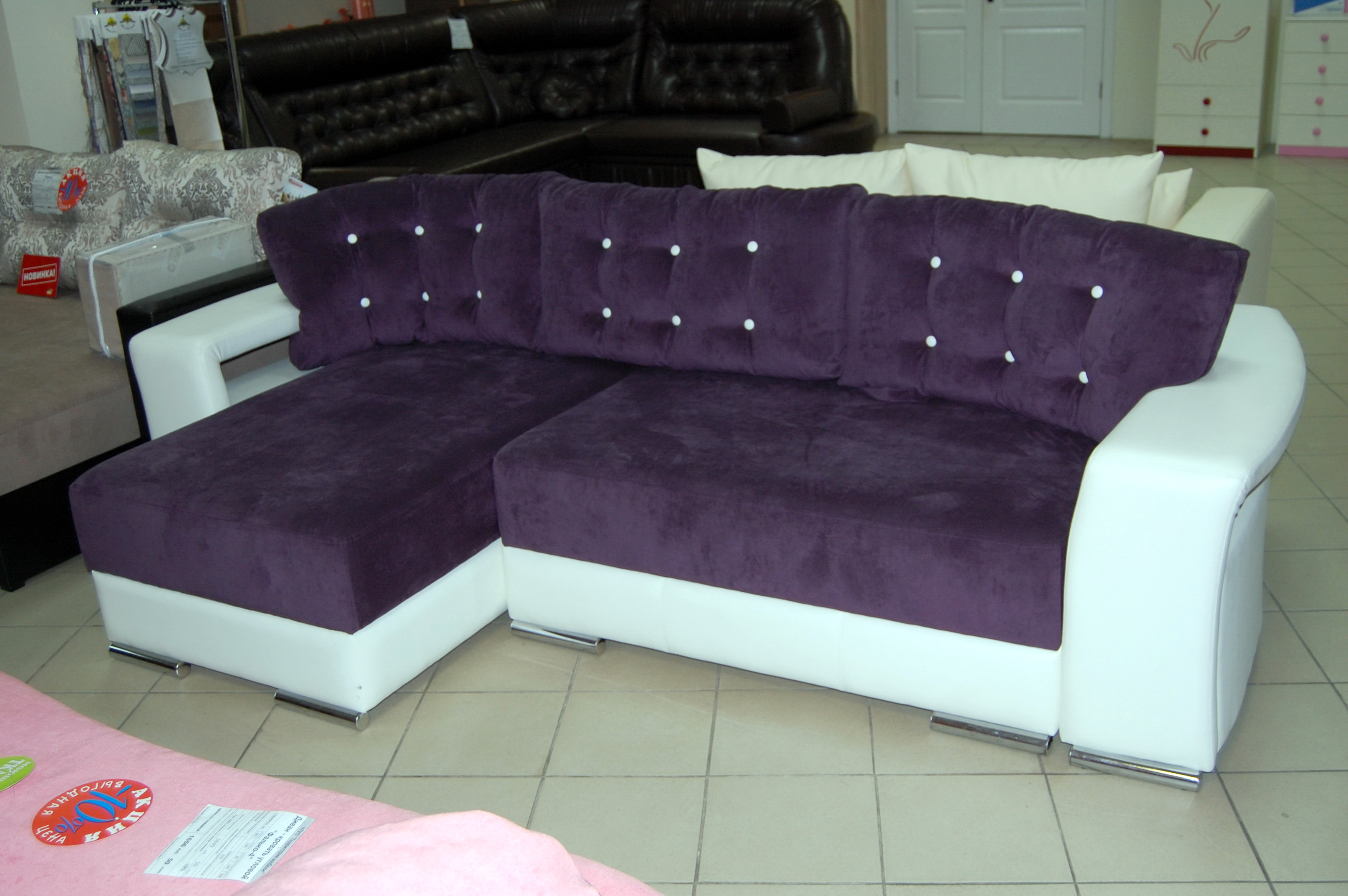 Крупногабаритный угловой диван. Кожаная обивка и вельвет двух цветов: фиолетовый и молочный. Сочетание таких цветов и рельефный декор подушек подчеркивают классический стиль дивана. Диван установлен на цилиндрические удлиненные хромированные ножки.