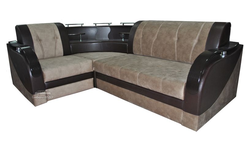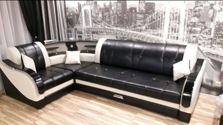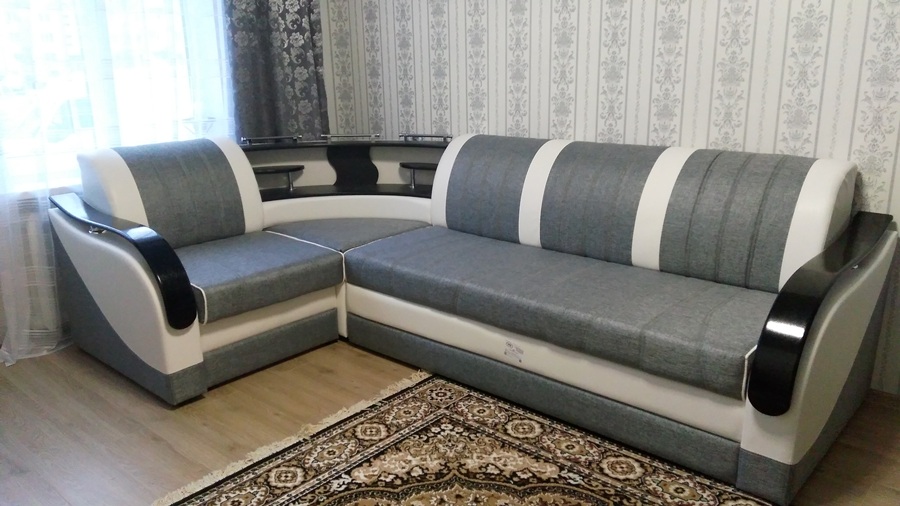 Нейтральный серо-белый общий тон тканевой обивки с фигурными черными вставками из глянцевой экокожи. Округлые подлокотники с деревянной накладкой, крепящейся хромированными деталями. Спинка разделена на два разноразмерных массива, соединенных несколькими полками цвета венге, выполняющий функцию журнального столика.