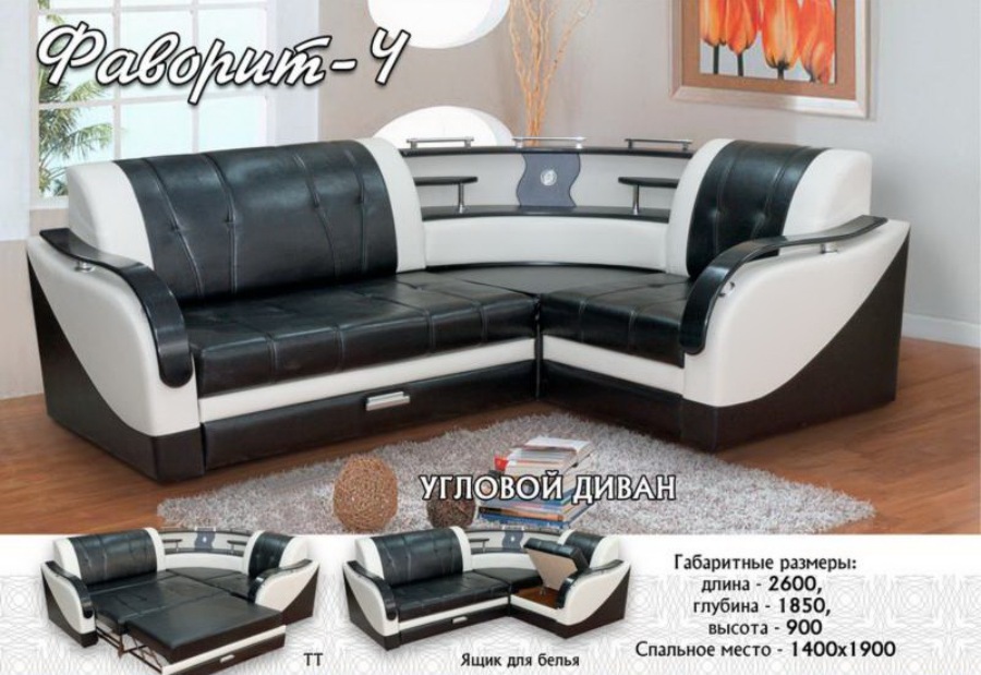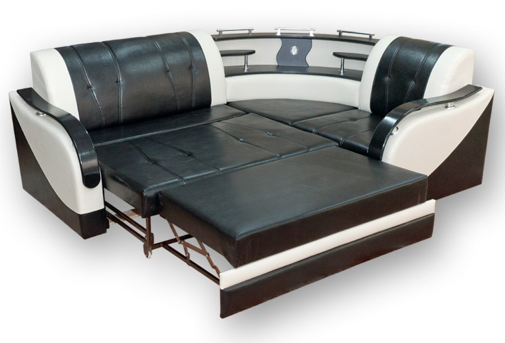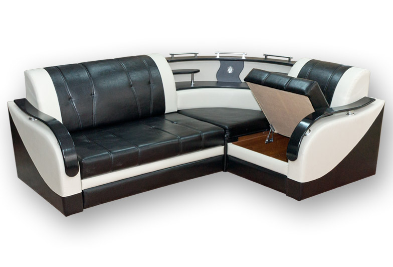 Черно-белый диван в обивке из экокожи с простежкой. Округлые подлокотники с черной глянцевой накладкой на хромированном креплении. Угол оформлен в виде радиусной двухуровневой полки с декором в тон накладкам.