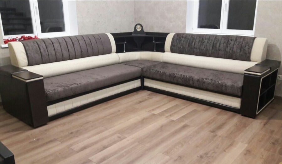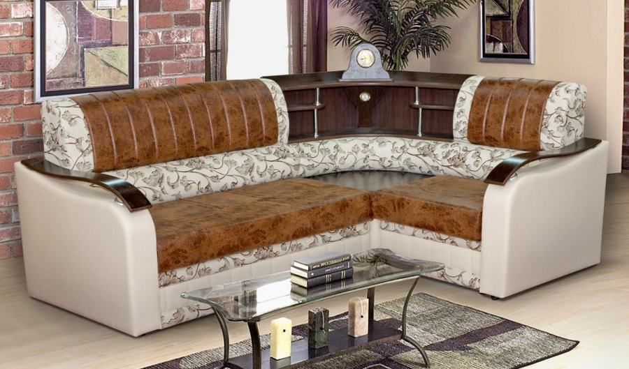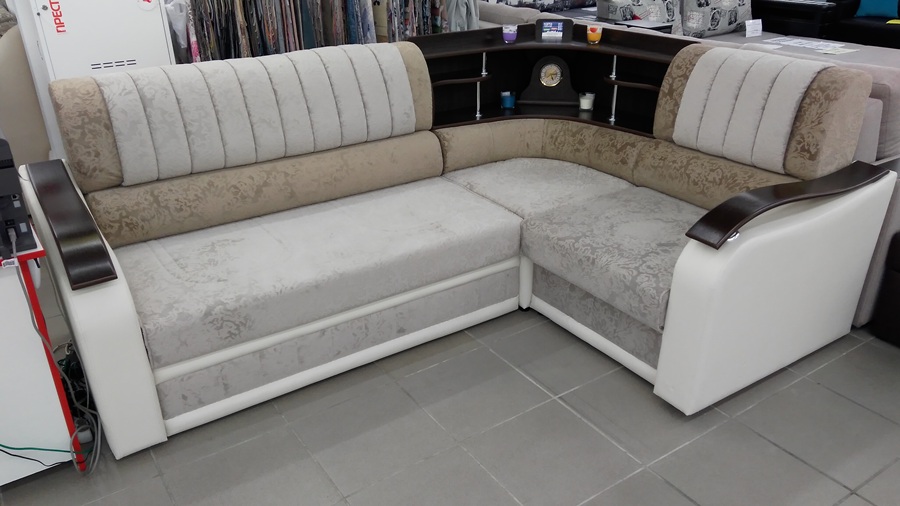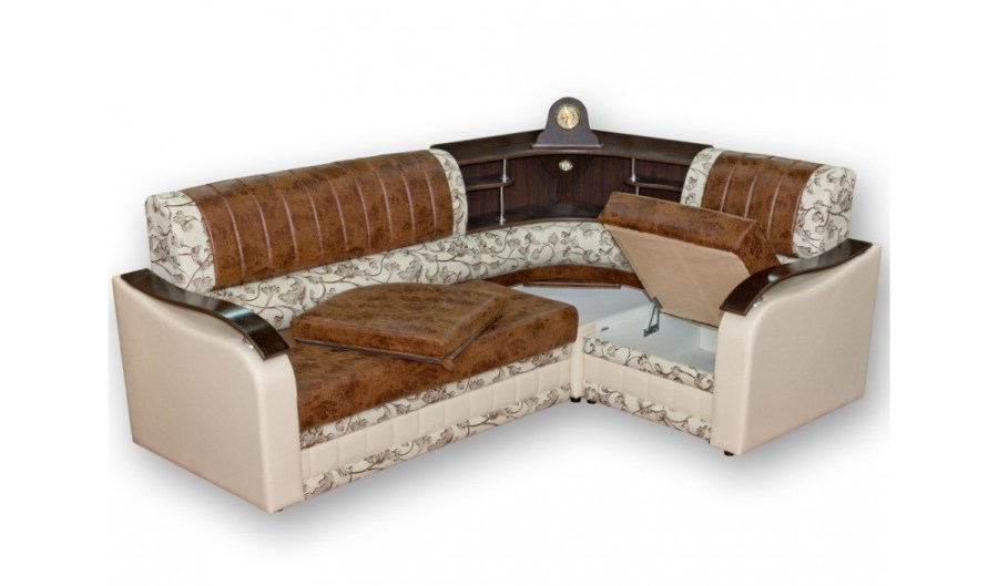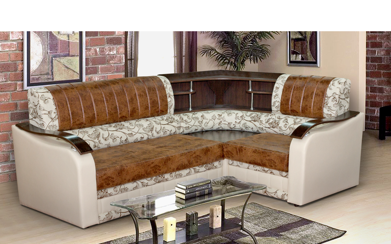 Диван угловой «Фаворит-8» - широкая модель с практичной обивкой в комбинированном цвете, полками и столиком. Конструкция выполнена в угловой форме. Полки расположены в подлокотнике и по центру изделия. Обивка из ткани мягкая и приятная на ощупь. На диване очень удобно отдыхать благодаря механизму «дельфин», который позволяет раскладывать мебель в полноценную широкую кровать.