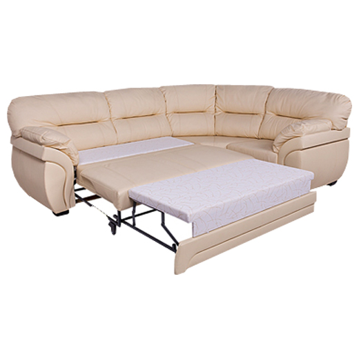 Угловой диван отличается просторным сиденьем и удобными накладками на подлокотники. Конструкция оснащена практичным механизмом трансформации, который позволяет дивану превращаться в комфортную кровать для сна. Мягкая обивка в светлом тоне придает модели элегантный и в это же время уютный вид.
