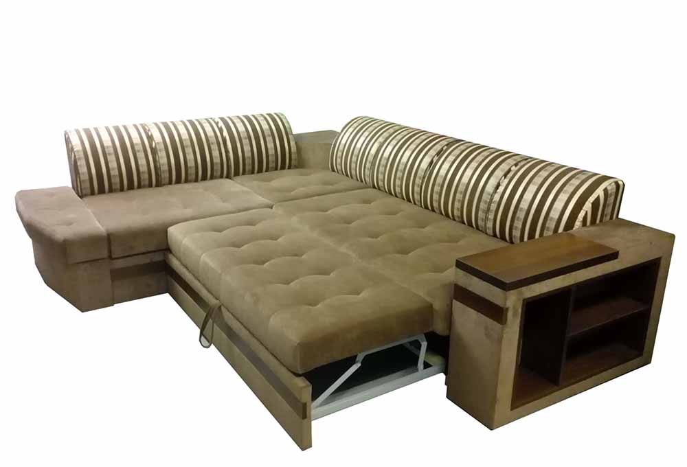 Благодаря удобному механизму трансформации, диван легко раскладывается, образуя просторное спальное место. В подлокотниках имеются вместительные встроенные полки. Внутри установлен независимый пружинный блок.