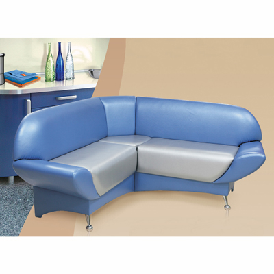 код 86243Просторный угловой диван с яркими полосками на спинке и сиденье. Основание в обивке из коричневой эко-кожи.