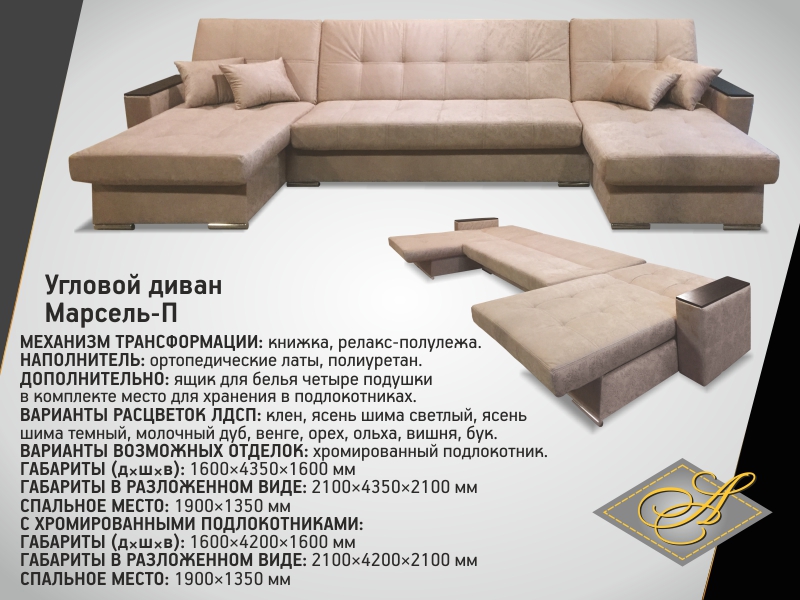 Размер (ШхВхГ) (Диваны): 4300*1000*1700 мм; 4050*1000*1700 мм (с хромированными подлокотниками)