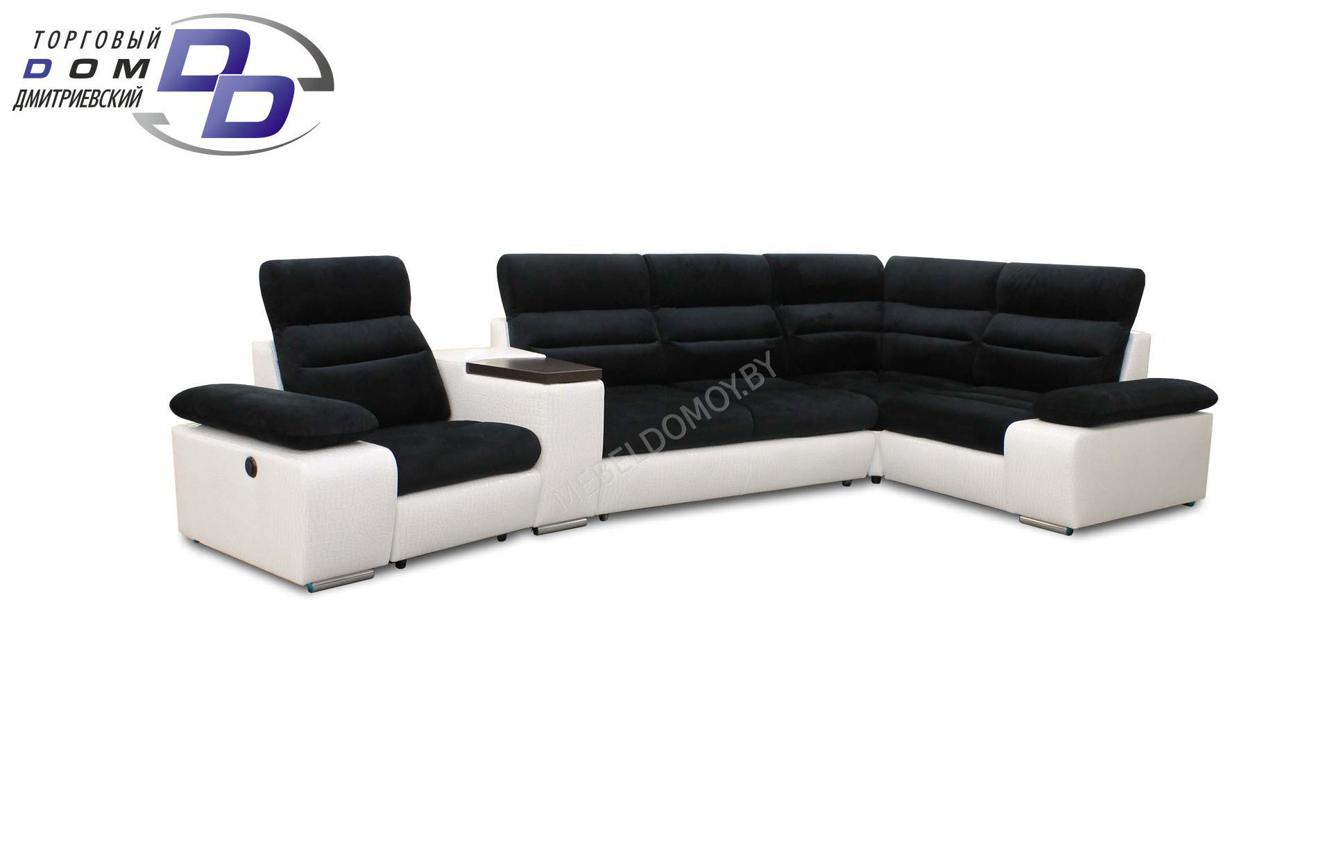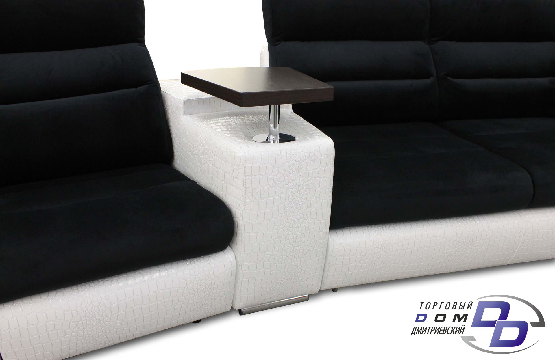Угловой диван «Венеция» выполнен в современном стиле и дополнен модельным креслом, соединенным широким подлокотником с подъемным деревянным столиком. Кресло оснащено реклайнером и откидной спинкой,что делает отдых в нем более комфортным и уютным. Также диван раскладывается и образует полноценное двуспальное место. Обивка выполнена в комбинированном цвете: основание из белой экокожи, имитирующей крокодилью, а сидение и спинка из черной мебельной ткани.