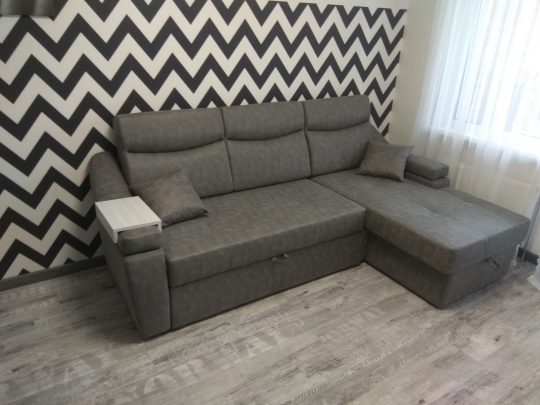 Эргономичный угловой диван серого цвета со спальным местом. По желанию заказчика размеры могут быть изменены. На одном из подлокотников установлен мини столик светлого цвета из ЛДСП. В комплекте идут небольшие декоративные подушки.