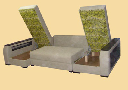 Угловой диван «Парадиз Люкс Каре» оснащен двумя вместительными нишами для белья. Боковины с внешней стороны оснащены небольшими полочками. Деревянные накладки на подлокотниках позволят комфортно расположиться с чашечкой чая. Механизм трансформации – еврокнига или тик-так.