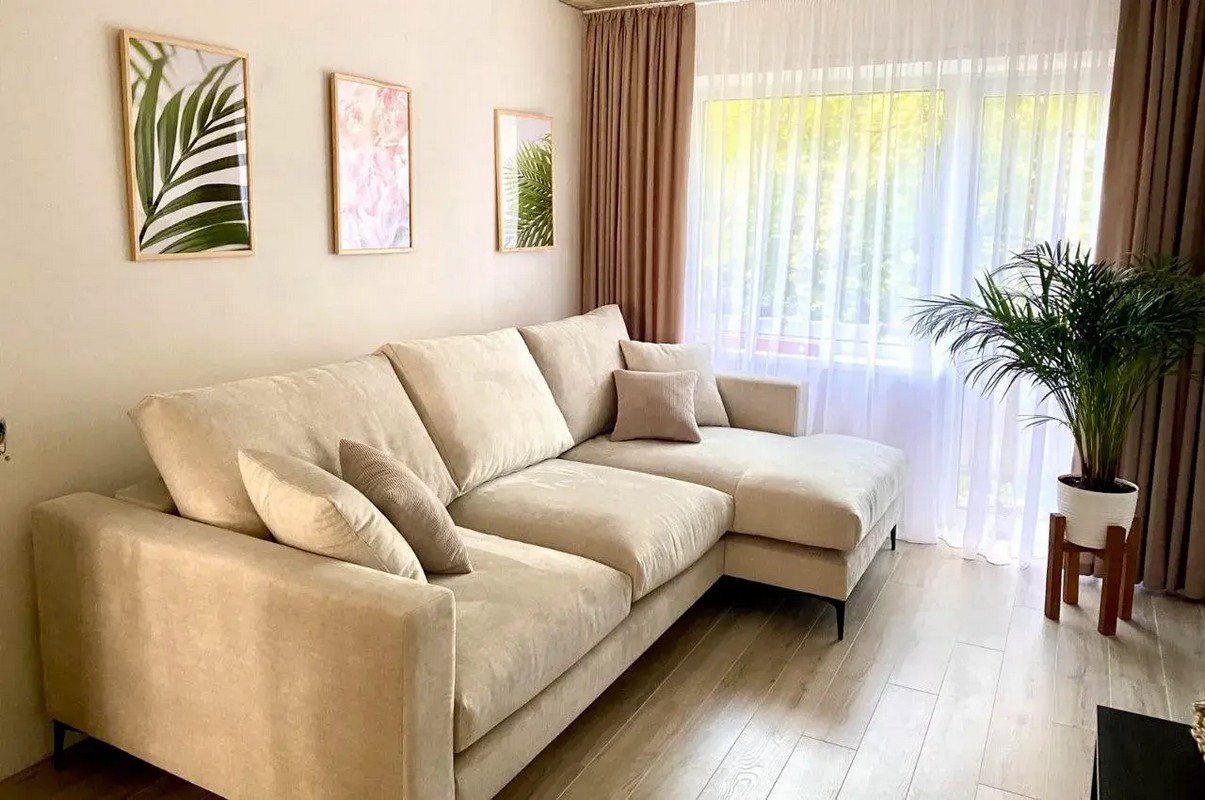 Негабаритный угловой диван с деревянными подлокотниками и большим спальным местом.