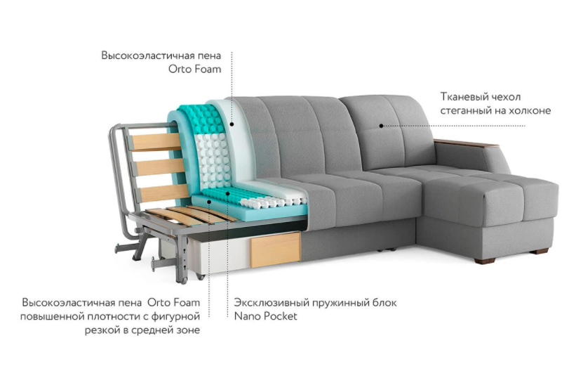 В основе дивана – высокий матрас, уникальный для такого вида трансформации. 7-зональный пружинный блок NanoPocket (блок независимых пружин высотой 2,5 см) поддерживает позвоночник в анатомически правильном положении, способствует комфортному расслаблению.