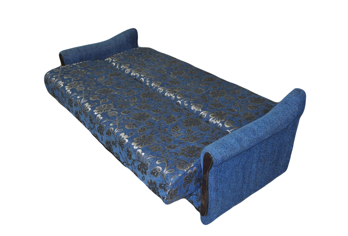 Представленная модель дивана «Уют» выполнена в глубоком синем цвете. Обивка дополнительно украшена цветочным узором. Боковины оснащены деревянными вставками. Конструкция оснащена механизмом трансформации.