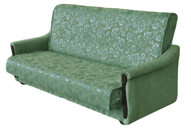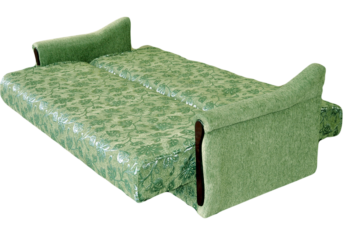 Диван «Уют» выполнен в приятном зеленом оттенке. Обивка украшена цветочным повторяющимся узором. Элегантный рисунок имеет легкий блеск, придающий мебели приятный внешний вид. Данная модель оснащена механизмом раскладки типа «книжка».