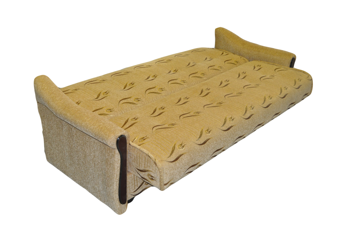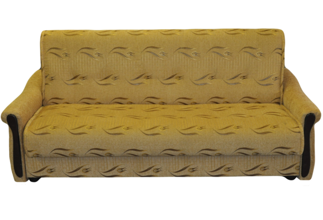 Данная модель дивана «Уют» исполнена в золотистом цвете. Подлокотники исполнены с высокими деревянными вставками. Обивку украшает элегантный повторяющийся узор. Широкая конструкция оснащена простым и удобным механизмом раскладки.
