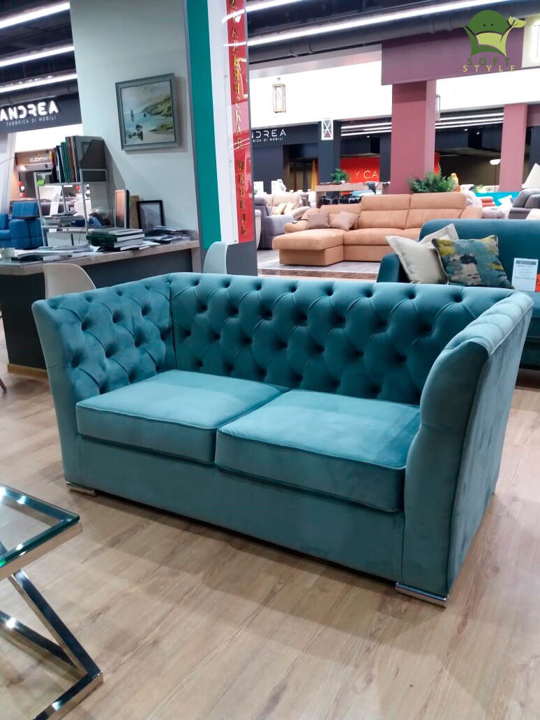 Представленная модель исполнена в обивке голубого цвета. Высокая спинка и подлокотники декорированы пиковкой. Сиденье глубокое и мягкое. Диван установлен на хромированных горизонтальных ножках.