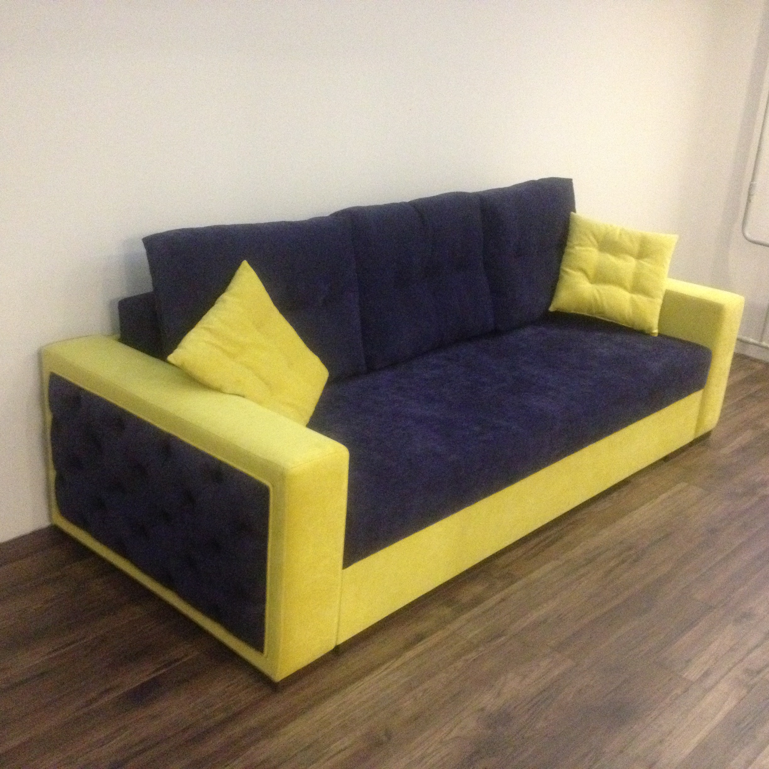 Комбинированная обивка классического прямого дивана добавит зальной комнате яркости и насыщенности. Цветовое оформление представлено синим и ярким желтым цветом. Мягкие боковины подлокотников декорированы стяжкой. Мягкие диванные подушки со стяжкой поспособствуют комфортному отдыху.
