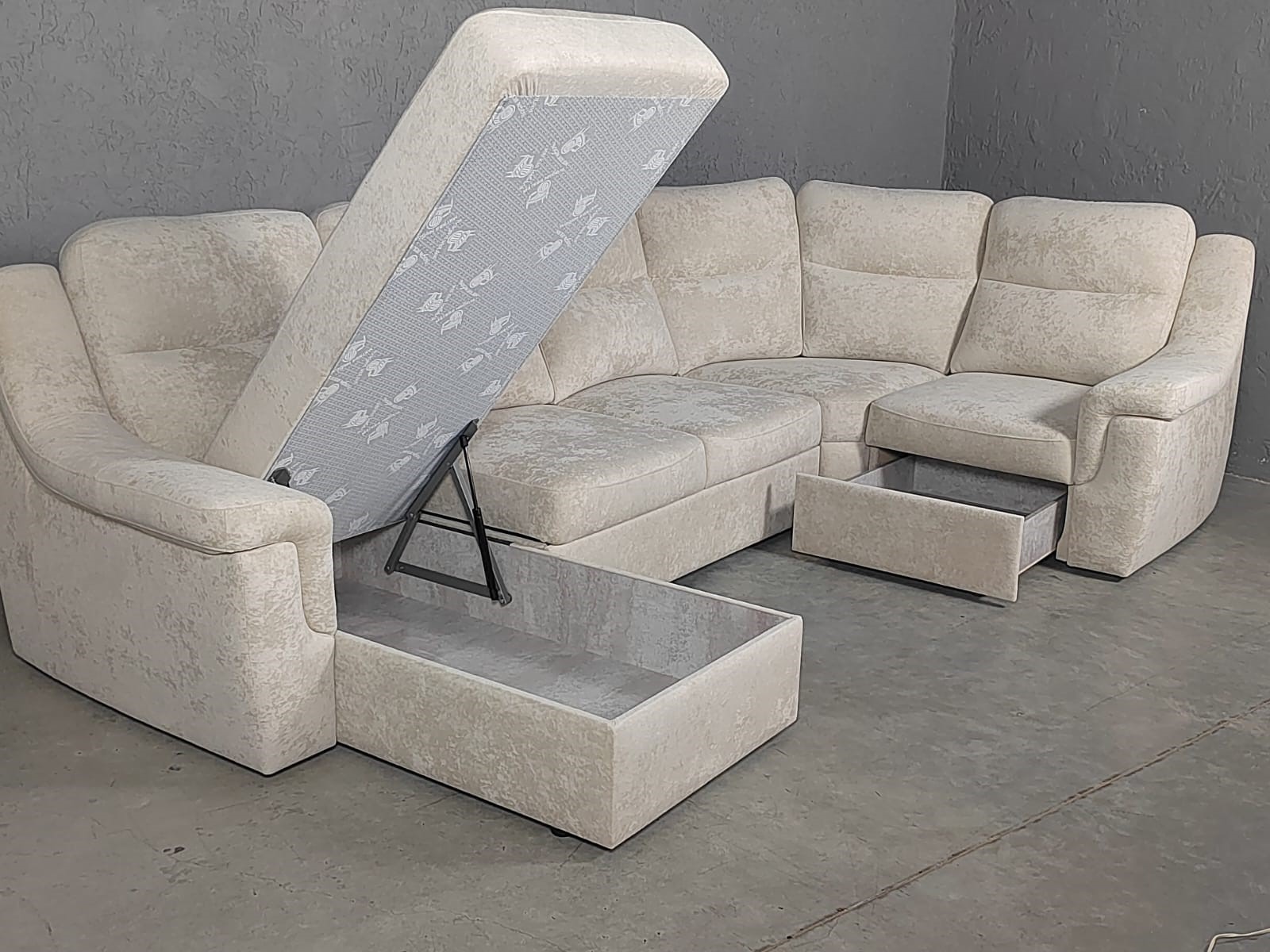 Подушки на угловой спинке и боковины украшены контрастной белой прострочкой.
