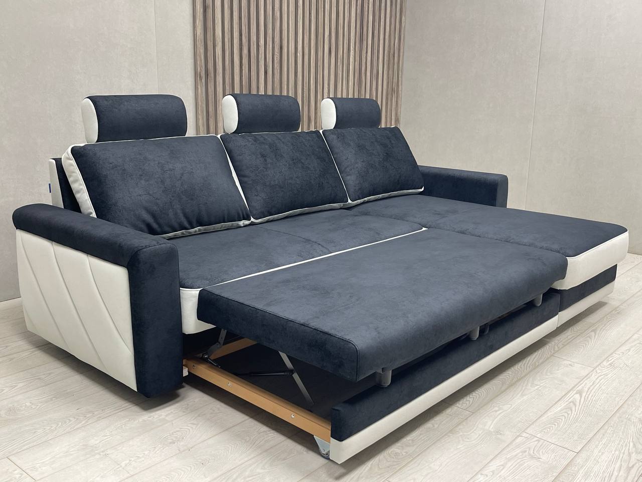 Увеличенное спальное место (1630 мм), быстро съемные подголовники, дополнительный просвет под диваном. В зависимости от необходимости покупателя – высота опорных ножек может быть 7 см или 10 см, соответственно этому механизм раскладывания дельфин изготавливается на НПБ или на ППУ и царга выполняется в двух вариантах — разделенный на 2 части (НПБ-7 см) и сплошной (ППУ-10 см).