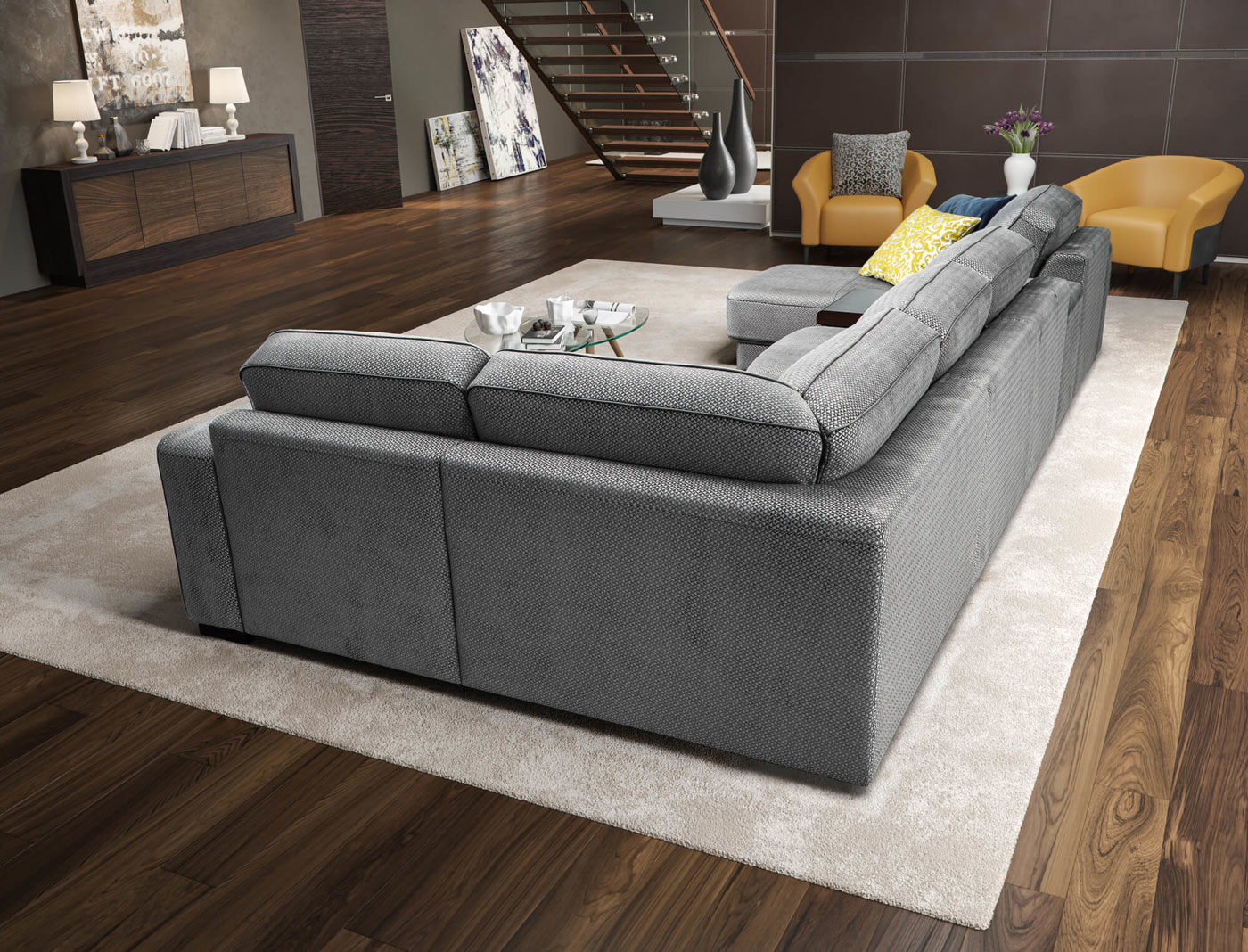 Любую комплектацию дивана можно дополнить встроенным баром для хранения напитков. LED-подсветка бара включается автоматически при открывании. Сдвижная столешница изготавливается с отделкой натуральным шпоном элитных пород дерева и покрывается прозрачным лаком или лаком в высоком глянце high gloss. Для модели инженерами möbel&zeit Gallery была разработана специальная версия уникального механизма Ergomatic®, предоставляющая возможность, не вставая с дивана, превратить его в огромный шезлонг.