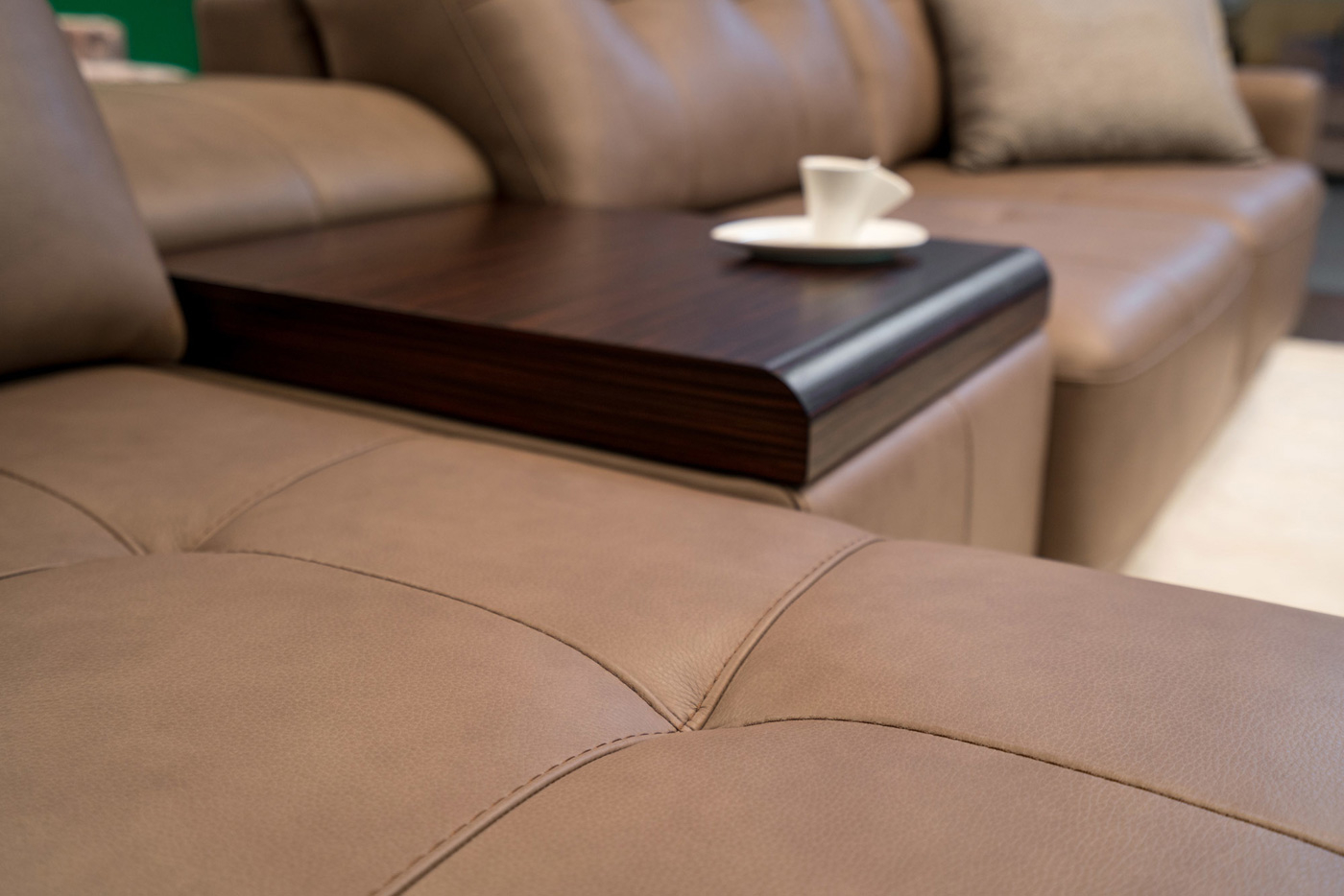 Любую комплектацию дивана можно дополнить встроенным баром для хранения напитков. LED-подсветка бара включается автоматически при открывании. Сдвижная столешница изготавливается с отделкой натуральным шпоном элитных пород дерева и покрывается прозрачным лаком или лаком в высоком глянце high gloss. Для модели инженерами möbel&zeit Gallery была разработана специальная версия уникального механизма Ergomatic®, предоставляющая возможность, не вставая с дивана, превратить его в огромный шезлонг.