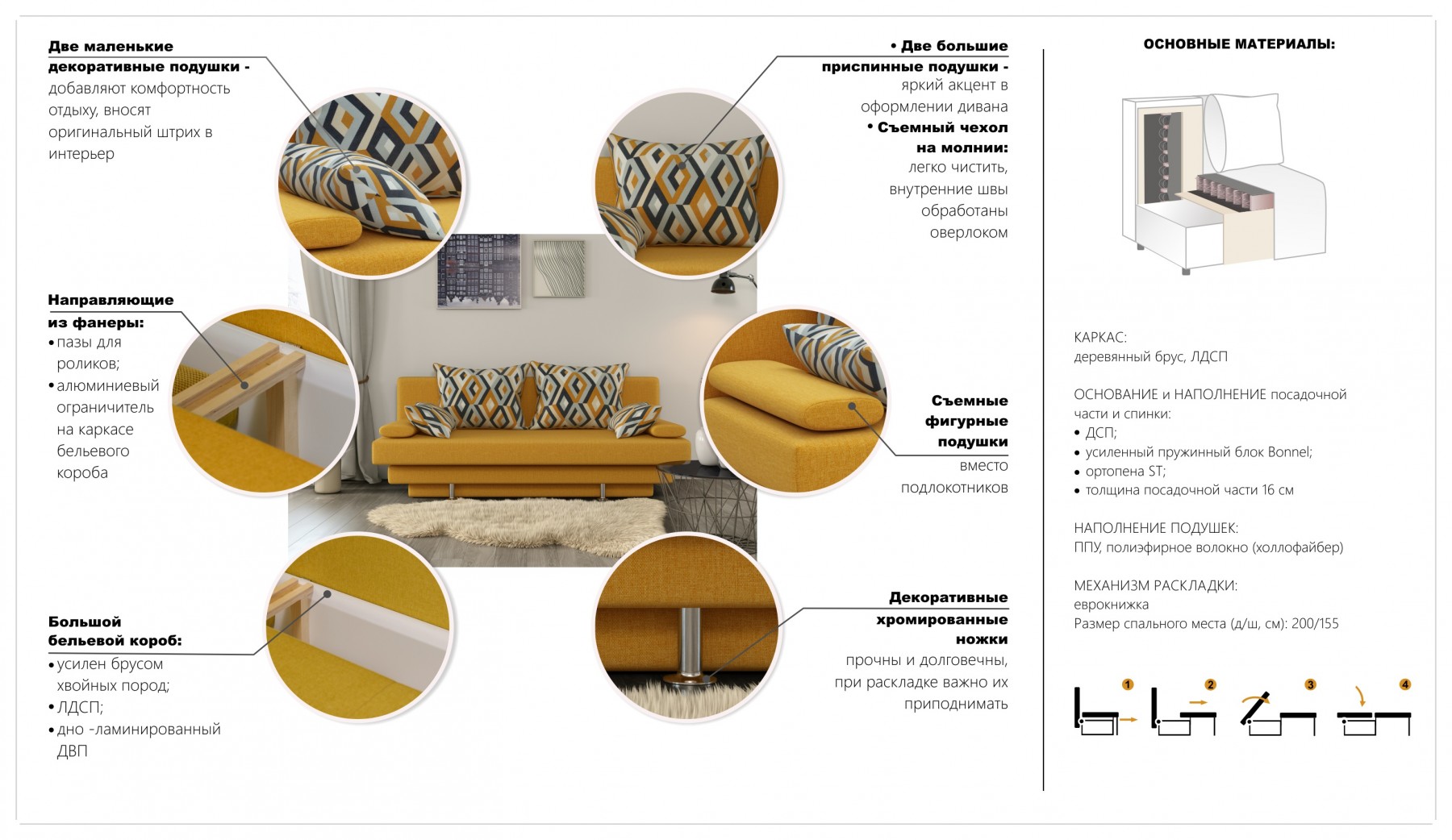 Механизм трансформации: тик-так. В комплект входят 4 большие и две декоративные подушки.