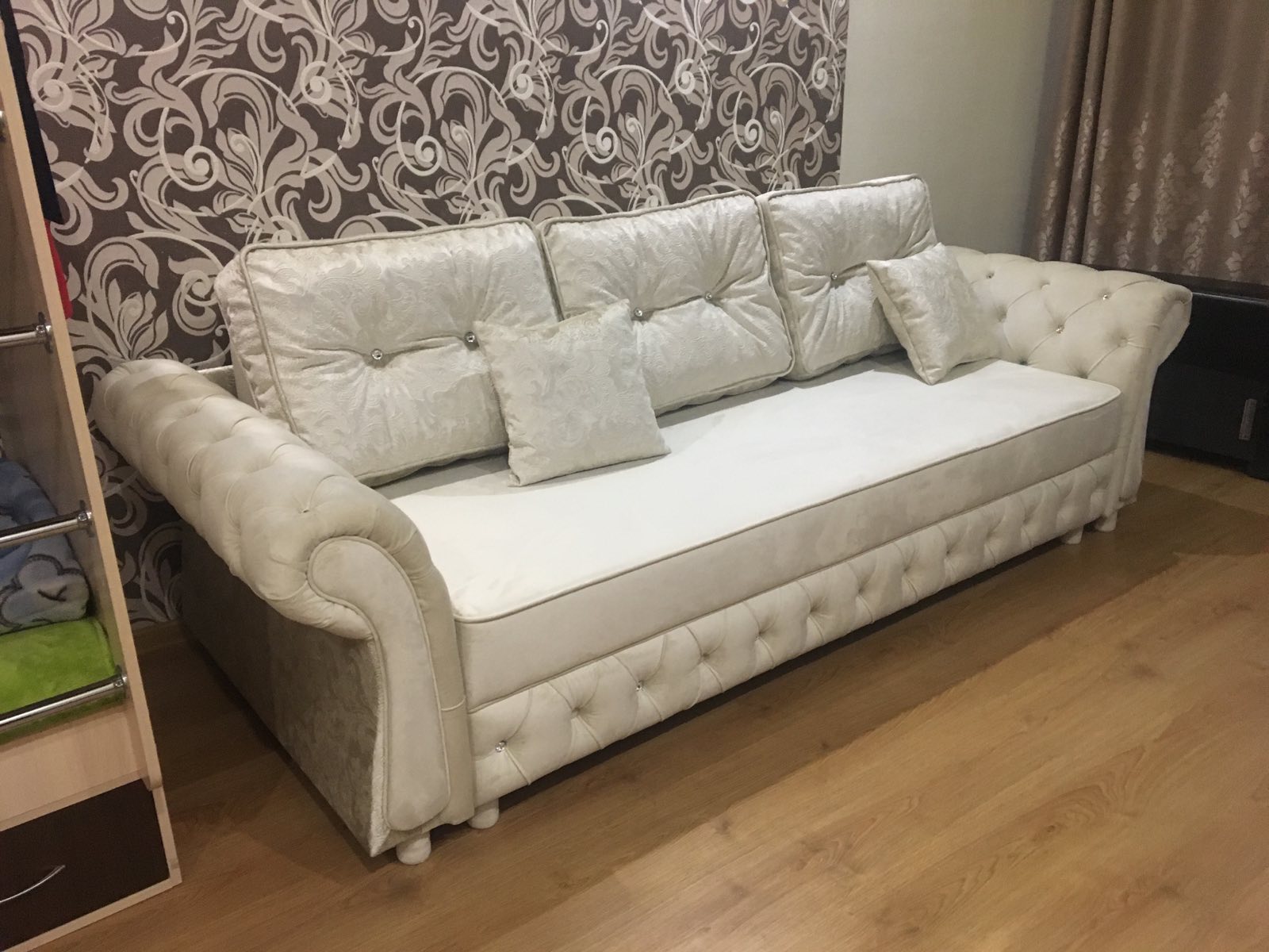 код 111824Декорирован стяжкой и стразами. Спинка-подушки. Удобное спальное место.