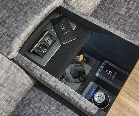 - дополнительные опции: отсеки с лампой и беспроводным зарядным устройством, панель с розеткой и USB-портами.