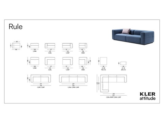 Комплект для гостиной с модульной системой, поэтому его можно идеально адаптировать к условиям интерьера. В то же время Rule может заинтриговать своей формой: строго геометрической, своим правильным порядком и дисциплиной. Украшением гладких поверхностей являются швы, выполненные точно под прямым углом. Возможны прямые и угловые диваны.Как опция- предложение подушек различных форм и размеров. Обивка из ткани; доступен широкий ассортимент тканей разных фактур и цветов из коллекции Kler Attitude.