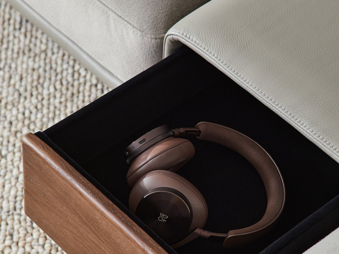 Полки в боковинах и твердые подлокотники с деревянными вставками. Современный стиль.