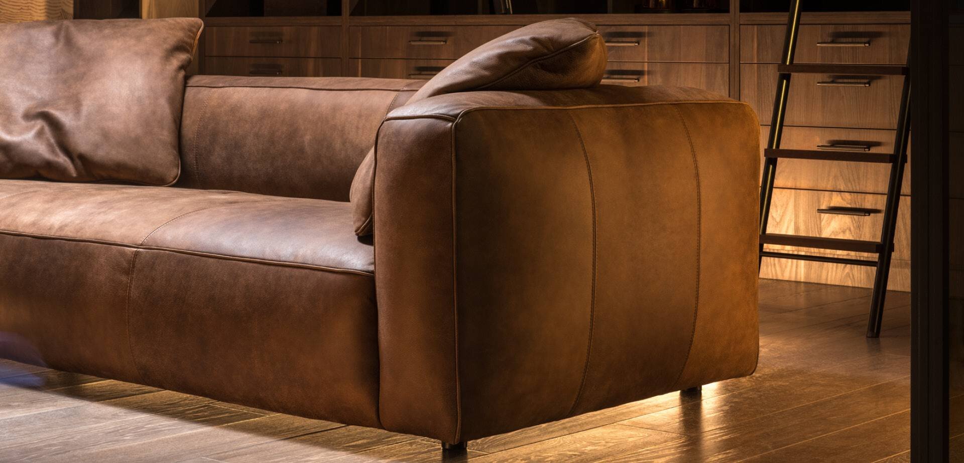 Комплект для отдыха, состоящий из 2-х и 3-х местных диванов, кресла и табурета • Дополнительная подушка для спинки (опционально) • Чехлы на выбор из широкого ассортимента кожи и тканей из коллекции Kler.