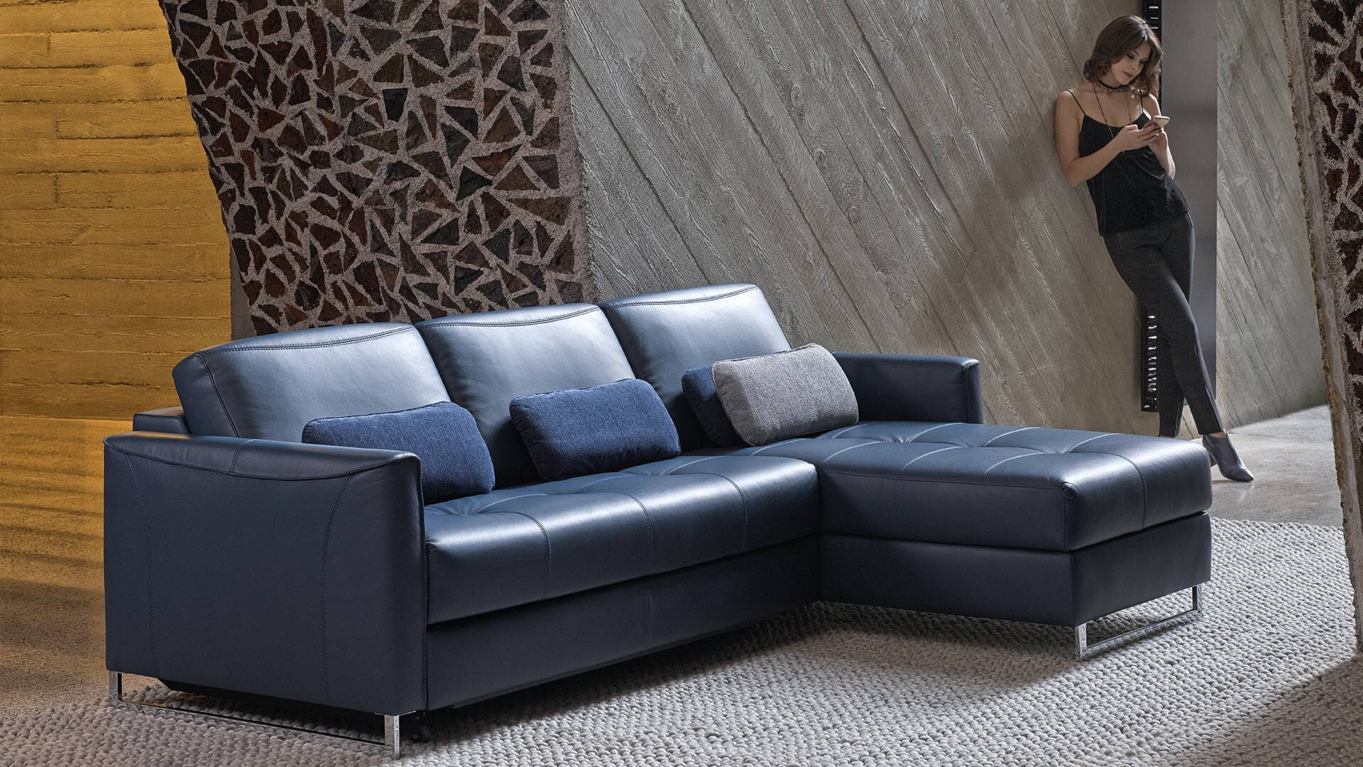 В комплект входят модульные диваны в продольной или угловой конфигурации и кресло • Модуль с удлиненным сиденьем (шезлонг), позволяющий удобно вытянуть ноги • Дополнительная комплектация: раскладная кровать, место для хранения вещей в шезлонге • Подъемная спинка • Чехол на выбор из широкого ассортимента кожи и тканей коллекции Kler • Ножки металлические – хром (опция: порошковое покрытие в 6 цветах на выбор).