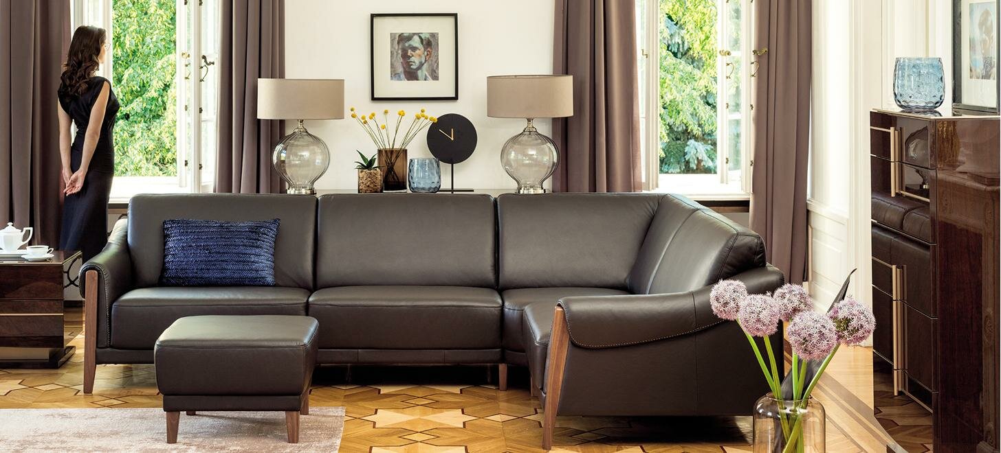 Комплект мебели для гостиной, состоящий из: 2-х и 3-х местных диванов, кресла и пуфа • Модули могут быть расположены продольно или углово • Модуль с удлиненным сиденьем (шезлонг), позволяющий удобно выпрямить ноги • Декоративный шов • Ножки из массива дерева (американский орех или дуб).