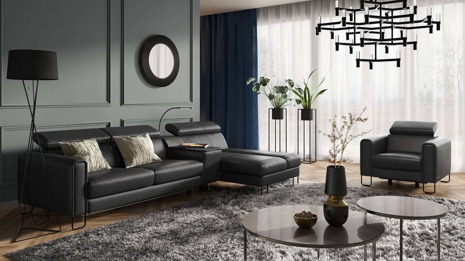 В комплект входят модули, позволяющие создавать 2- и 3-местные диваны, кресло и скамеечку для ног - Модули, составленные в продольном или угловом расположении - 3-местный диван-раскладушка с матрасом, предназначенный для ежедневного сна - Модуль удлиненного сиденья (шезлонг) с регулируемым подлокотником он также служит в качестве углового модуля для спинки с функцией терминальной релаксации, которая позволяет подставке для ног выдвигаться, а спинке откидываться назад - Управляется и питается от электричества - Опция: Включение функции релаксации с помощью аккумулятора - Подголовник с ручной регулировкой угла наклона - Отделение для хранения/контейнер в терминале или шезлонге - Барная стойка/отделение для хранения с регулируемой, поворотной, обитой тканью столешницей; дополнительное оборудование: два холодильника с индукционным зарядным устройством, лампа, панель с розеткой питания, USB-порты - Покрытие на выбор из широкого ассортимента кожи и ткани из коллекции Kler - Металлические ножки, черные, с порошковым покрытием; опция: выбор из 5 других цветов.