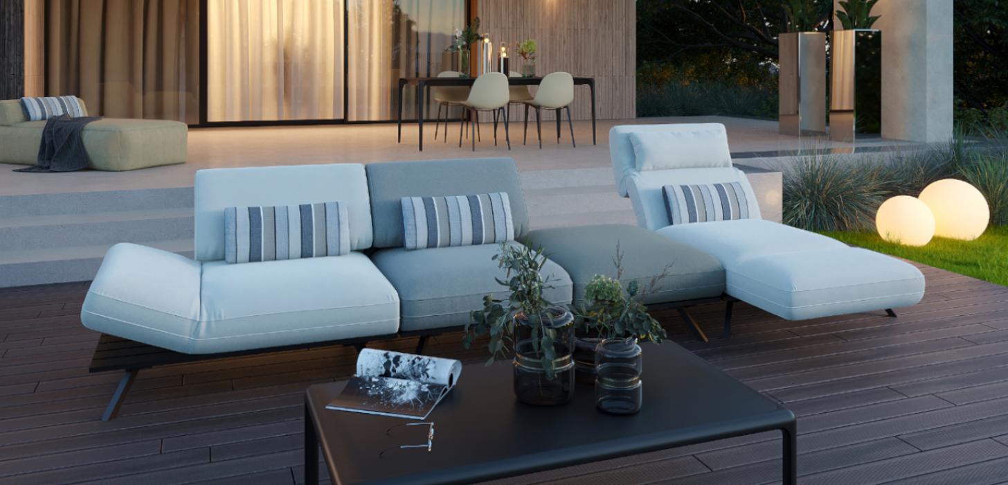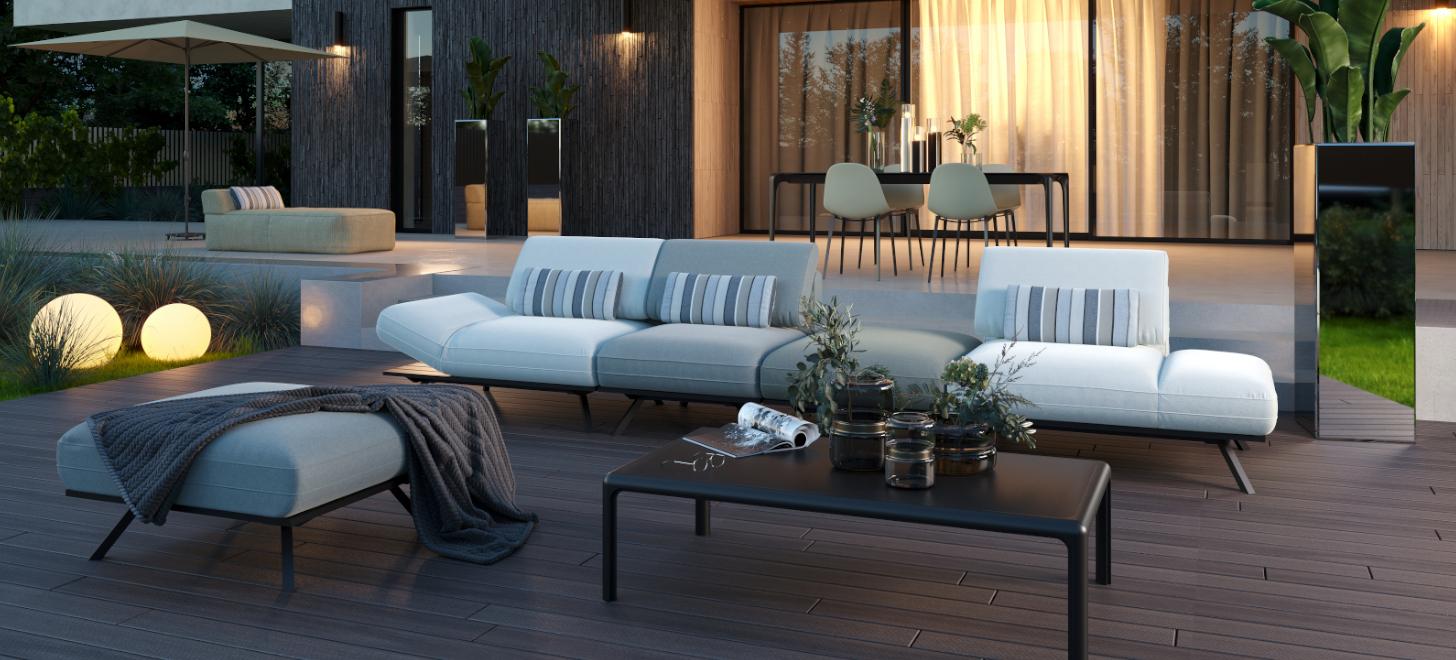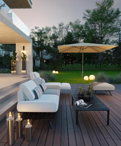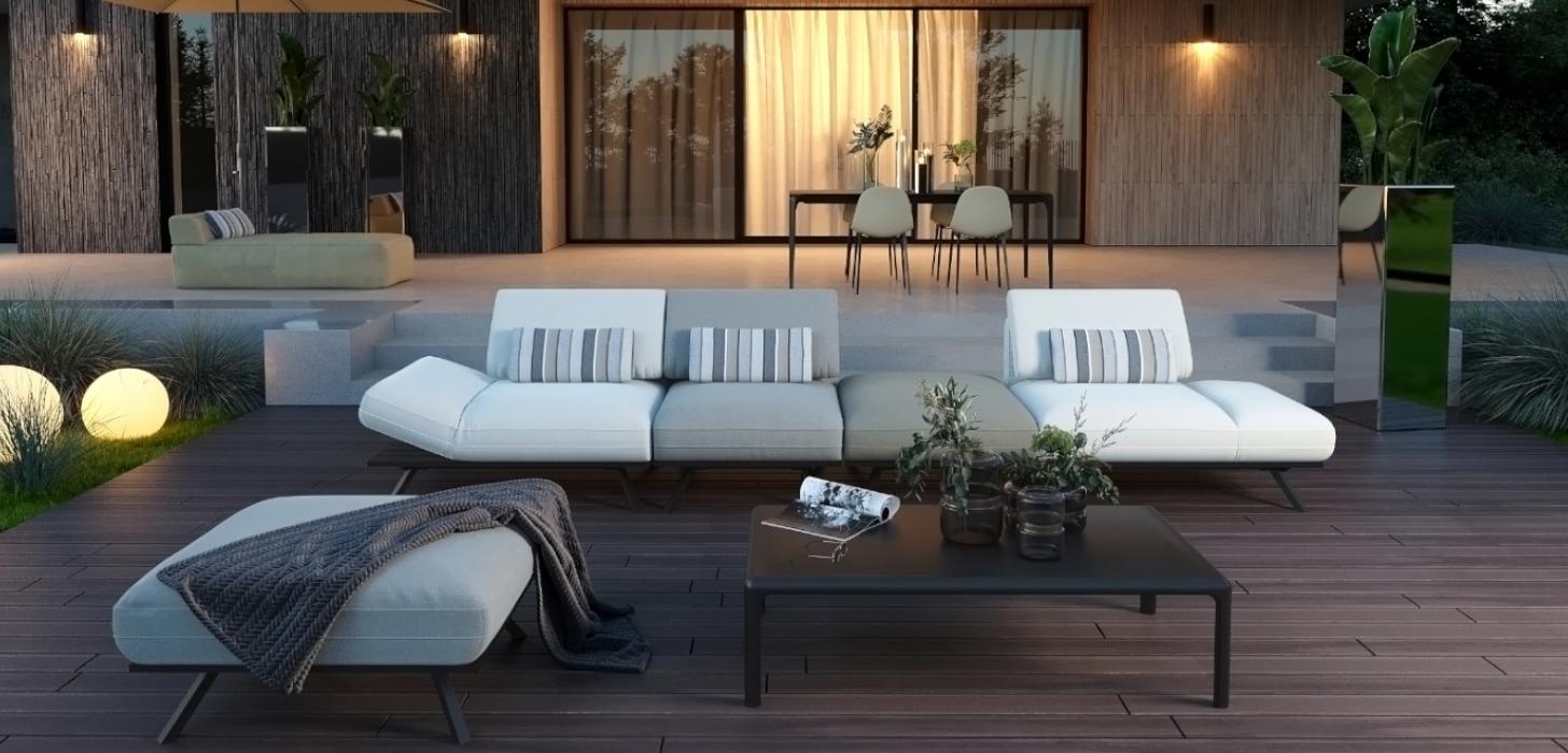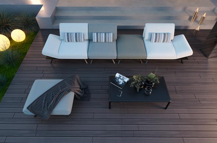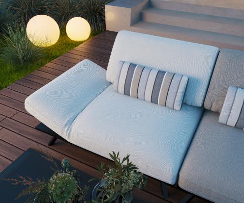 Комплект создан для отдыха на терассе. Создается из индивидуального расположения модулей. Плоские подушки брошены здесь на легкую жесткую платформу, приподнятую на ножках. Так рождается свободная, разнообразная компоновка: повторяющиеся модули подушек и сопровождающие их откидывающиеся спинки, подголовники, гибкие подлокотники, трансформируемые в подставки для ног.