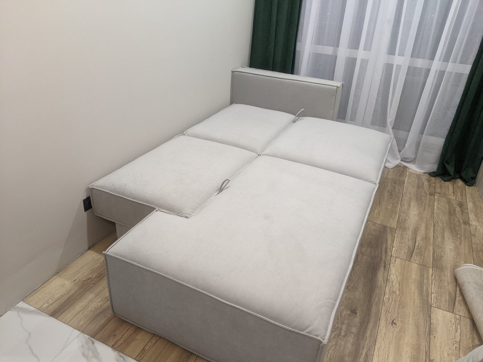 Современный диван со спальным местом и нишей для хранения.