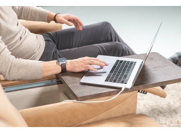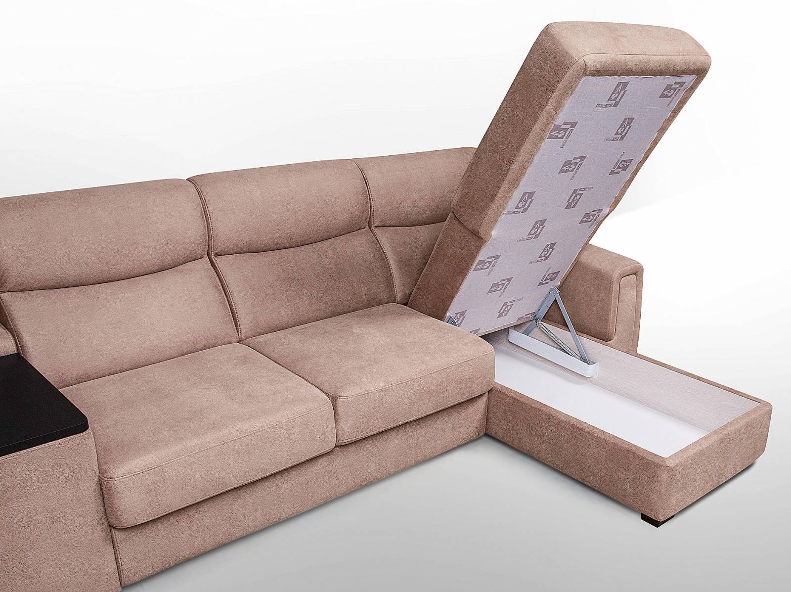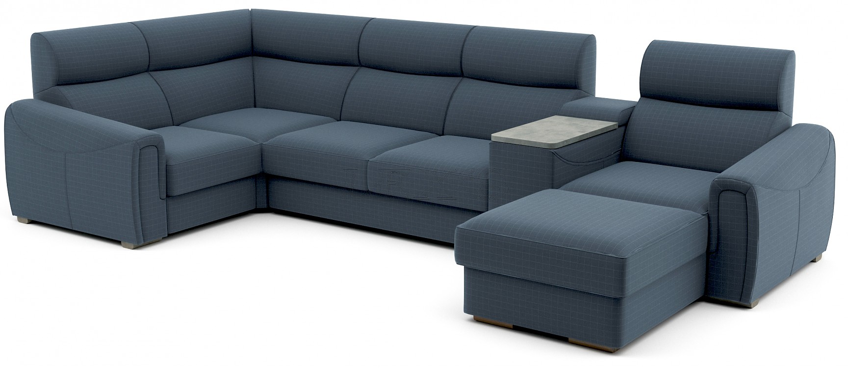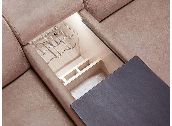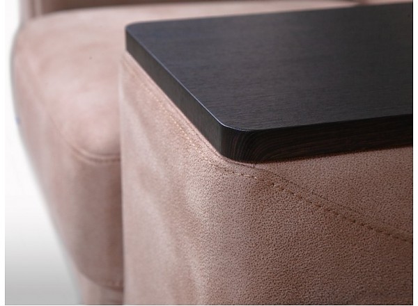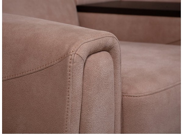 Современный стиль. Полки в боковинах и широкие подлокотники с деревянными вставками