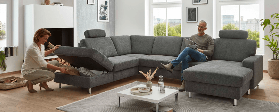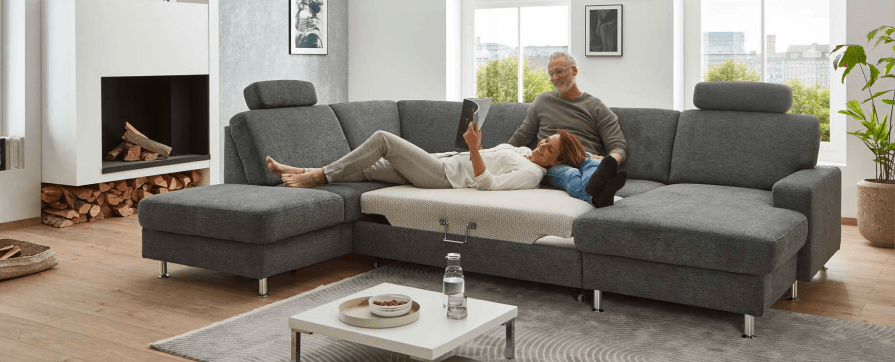Размер (ШхГхВ): 366х334х101 см. Регулируемые подголовники, электрическая функция релаксации, раскладная кровать, место для хранения, два контейнера для постельных принадлежностей.