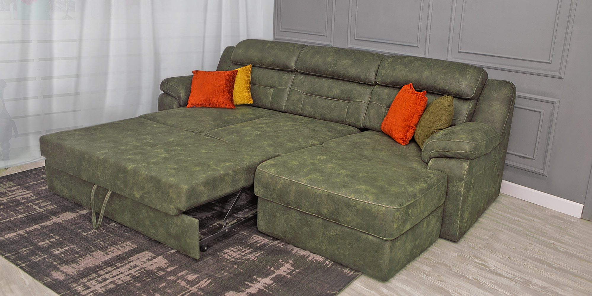 Удобный механизм раскладки. Спинка декорирована подушками.