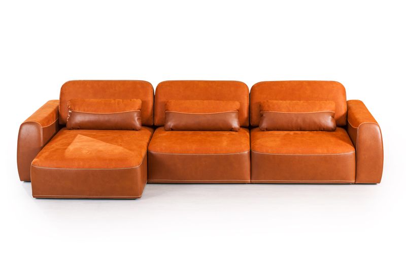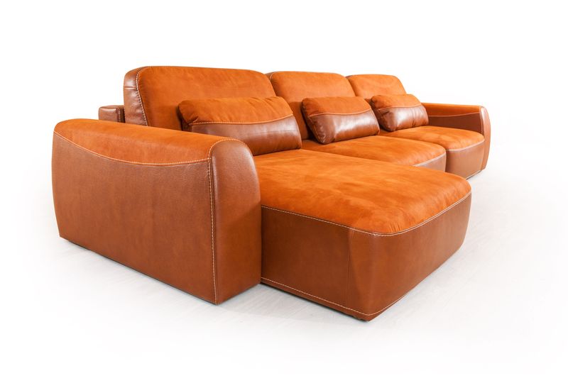 Подушки на угловой спинке и боковины украшены контрастной белой прострочкой.