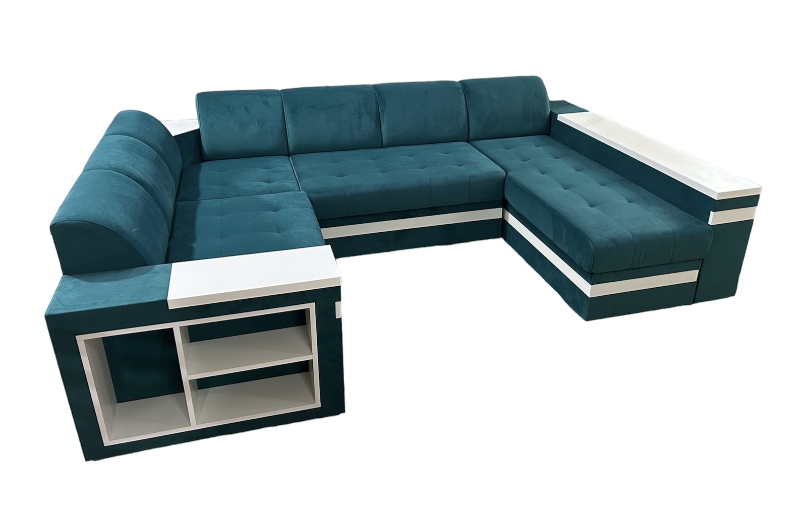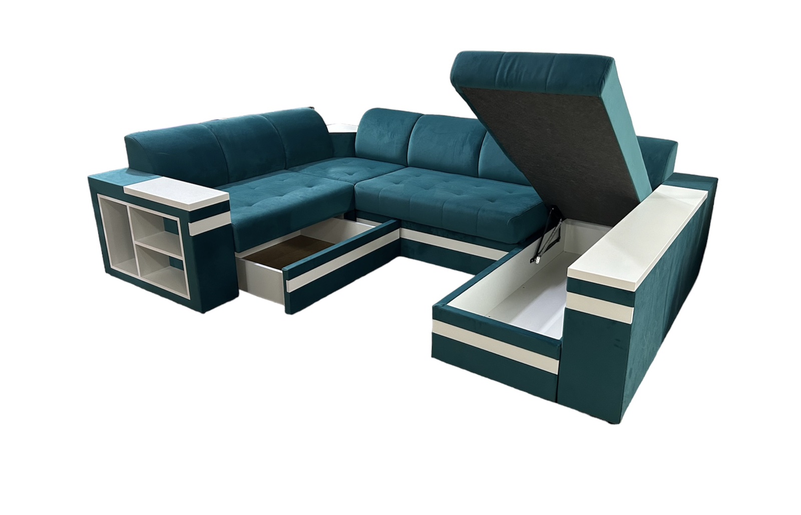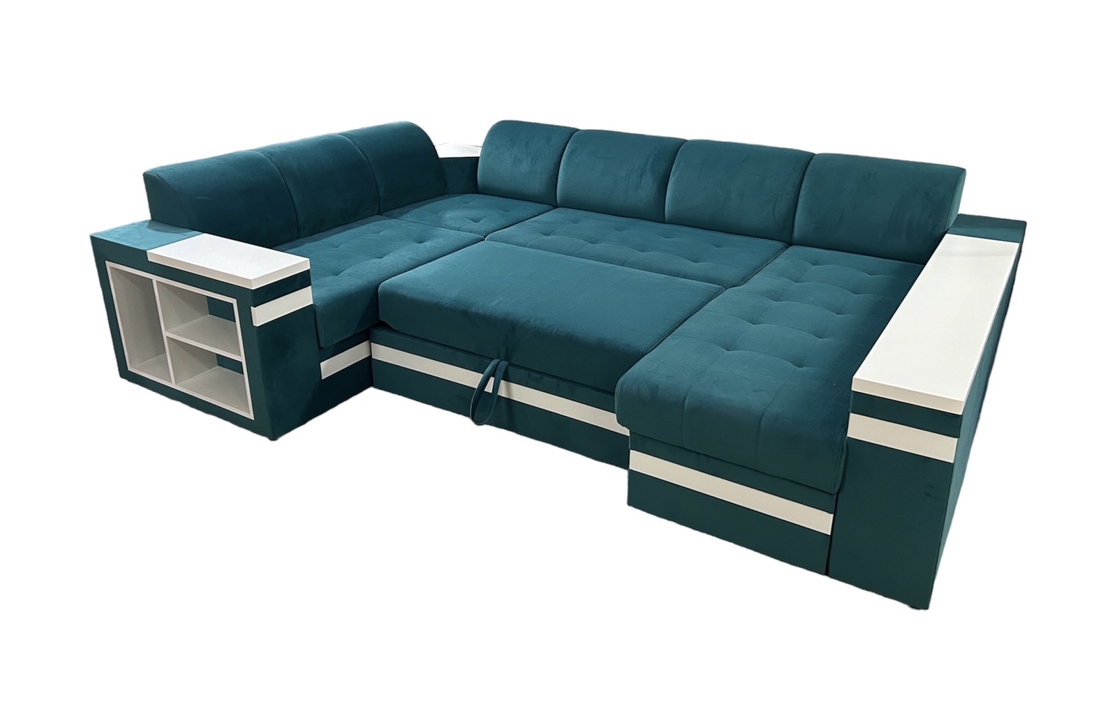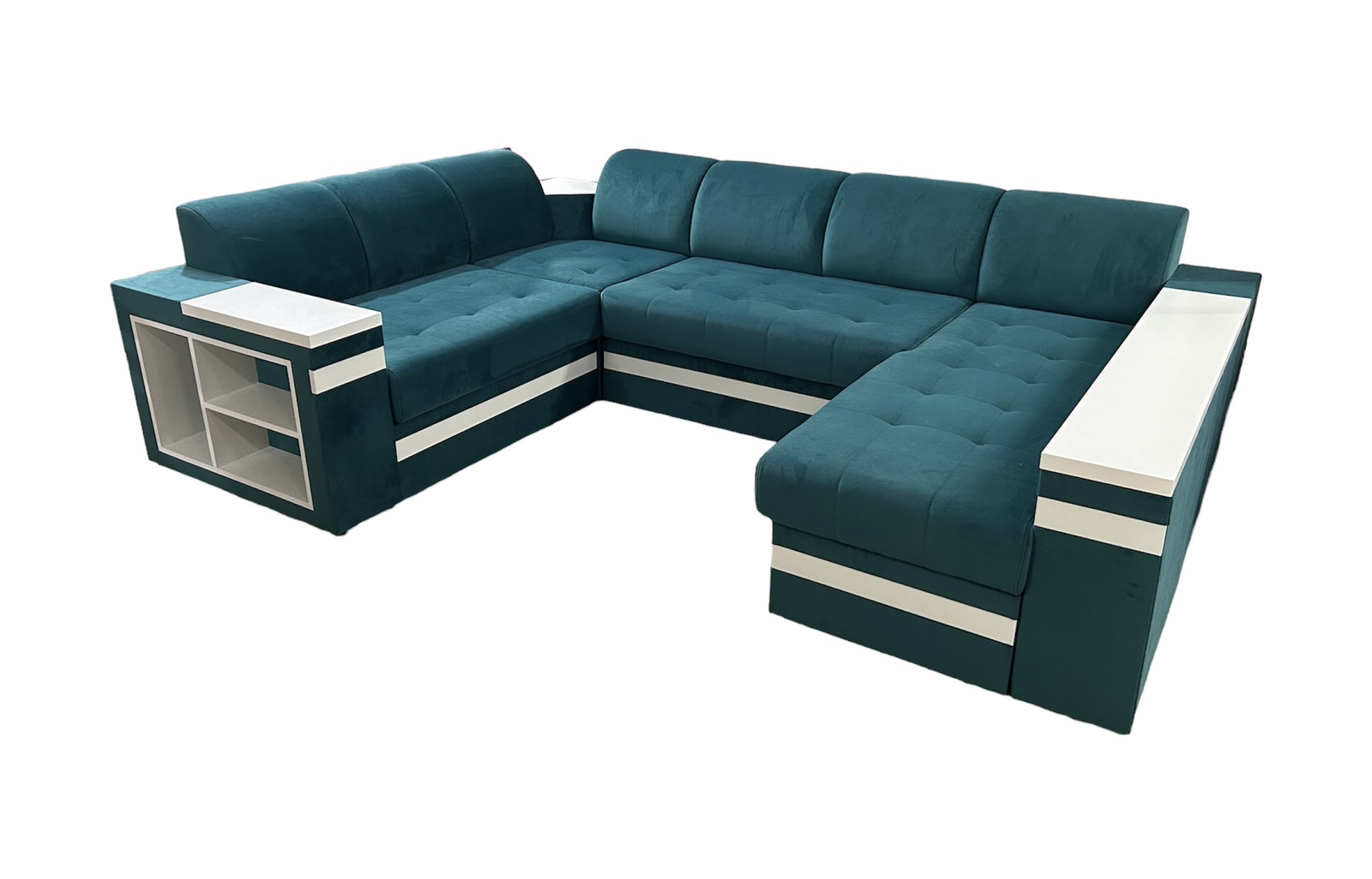Диван станет стильным дополнением к любому интерьеру. Он идеально подойдёт для гостиной, детской комнаты или зоны отдыха. Бирюзовый цвет придаст помещению свежесть и яркость. Полки в подлокотниках помогут организовать пространство и сохранить любимые вещи под рукой. Декоративная стяжка добавит изысканности и элегантности общему виду дивана.