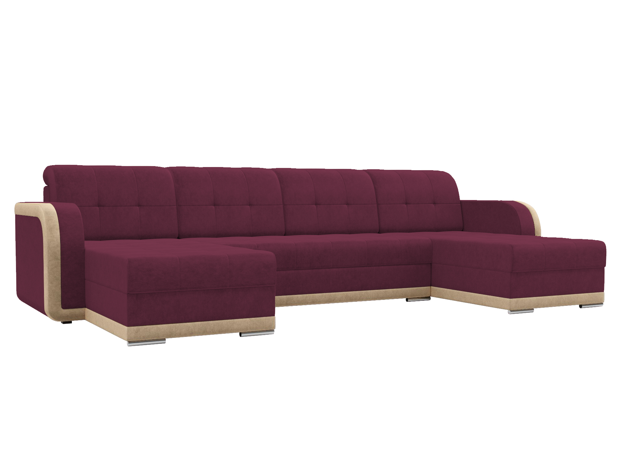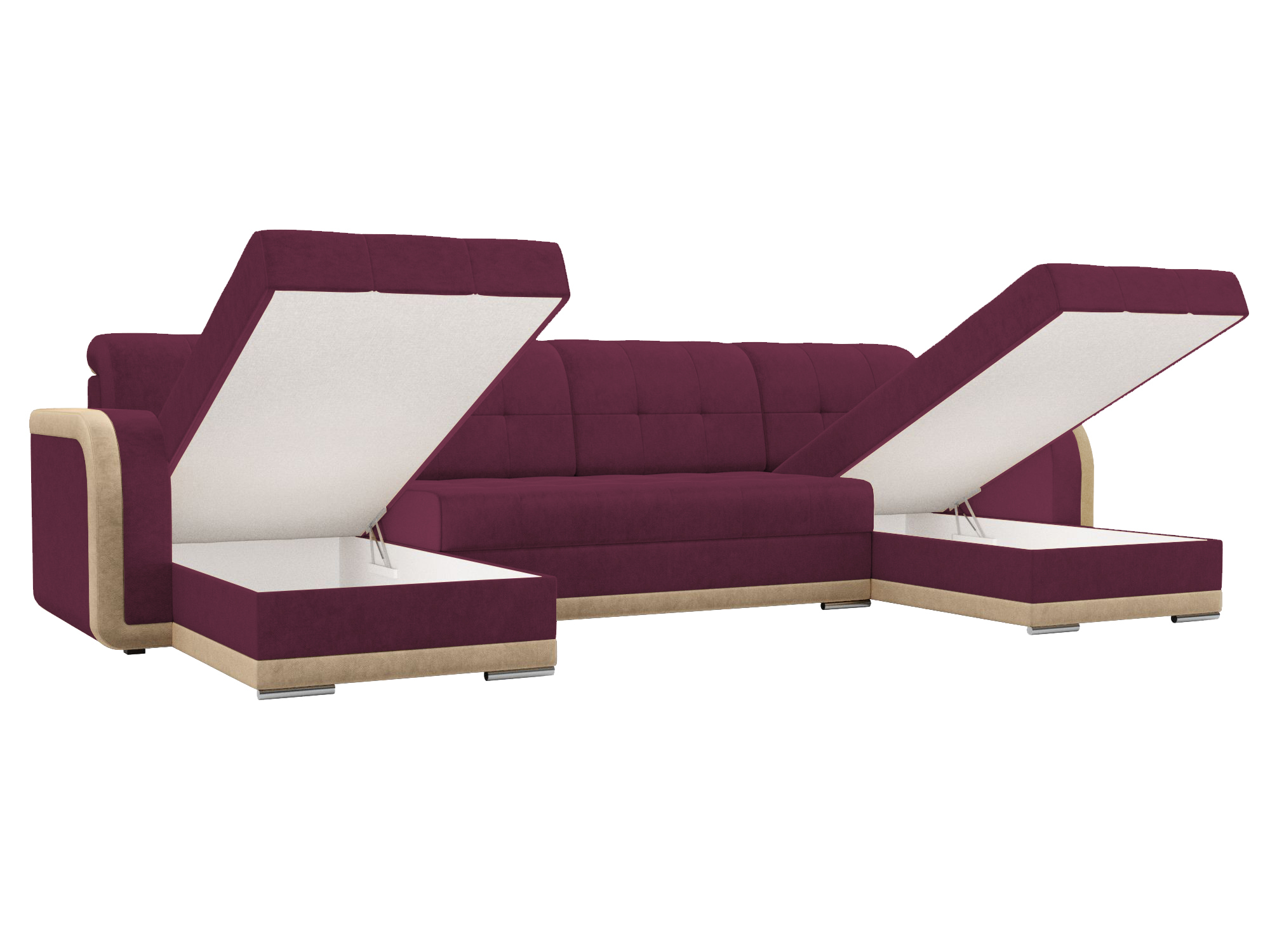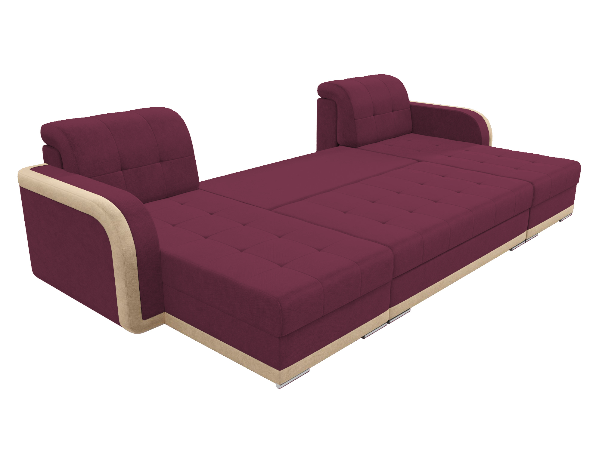 Хромированные опоры, большое спальное место, спинки-подушки, бельевой ящик.