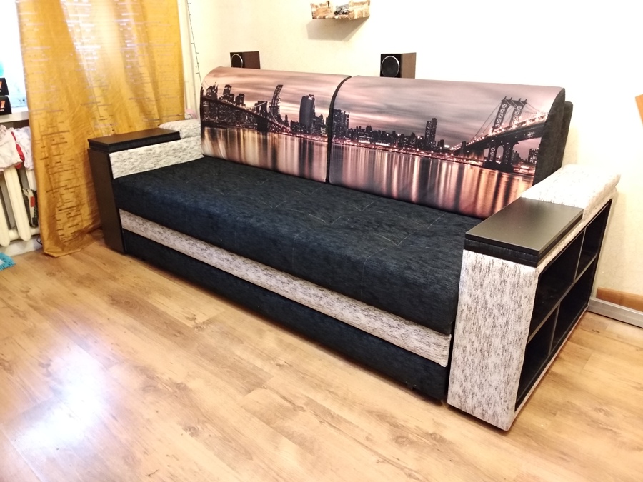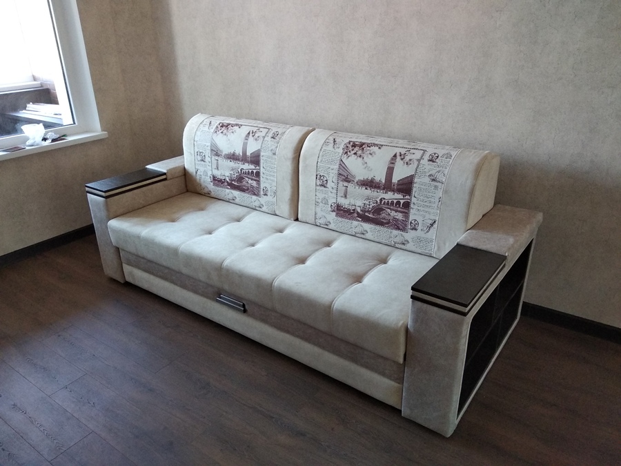 код 92948Прямой диван с приятной обивкой, двумя подушками с фотопечатью и прямыми подлокотниками.