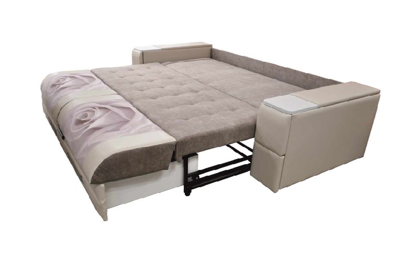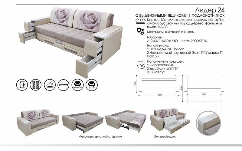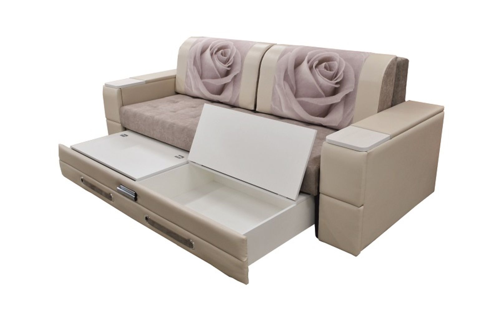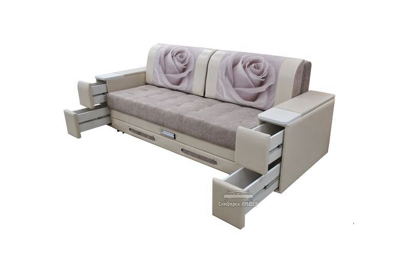Диван выполнен в спокойных бежевых тонах, на спинке изображения цветов. В подлокотниках расположены четыре выдвижных ящика. Диван оборудован выкатным механизмом трансформации.