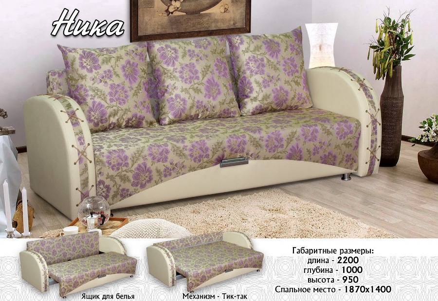 код 92942Прямой диван с цветочным дизайном и декоративными элементами на боковых частях.