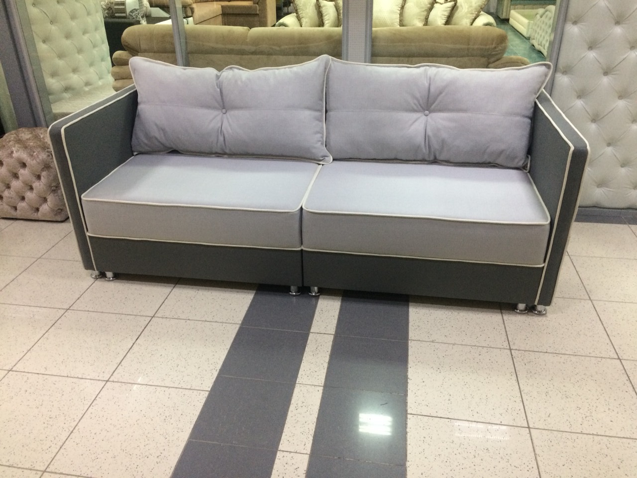 Прямой диван компактных размеров удачно впишется в небольшую комнату. Благодаря удобной системе трансформации, диван легко можно превратить в комфортное спальное место. Модель выполнена в комбинированных цветах и украшена белым швом. Установлен на надежные хромированные ножки.