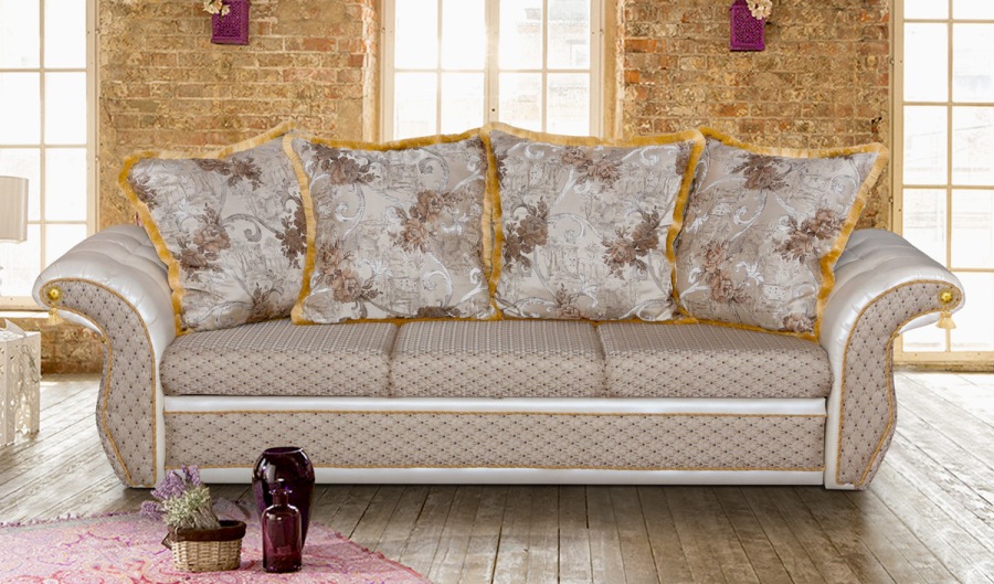Прямой диван с дорогим оформлением и тремя декоративными подушками.