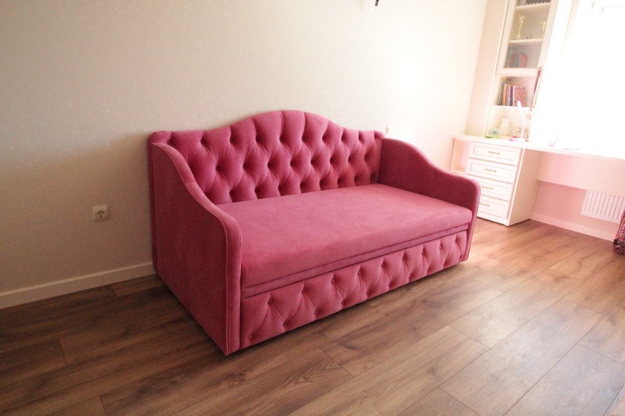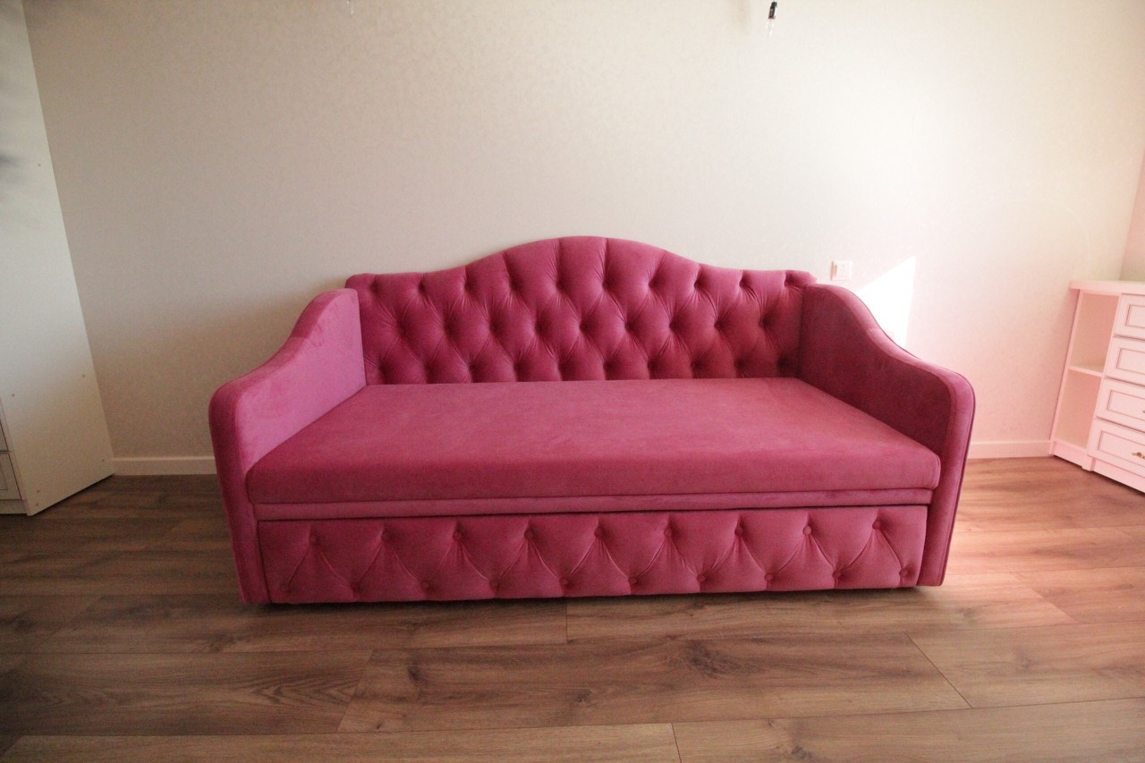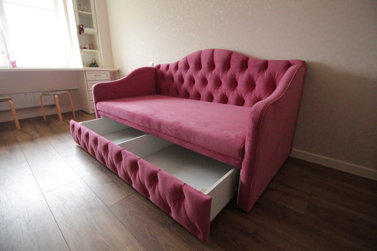 Прямой диван с высокими бортиками выполнен в розовой обивке. Спинка и основание дивана украшены пиковкой. Модель оснащена двумя вместительными отсеками для постельных принадлежностей.