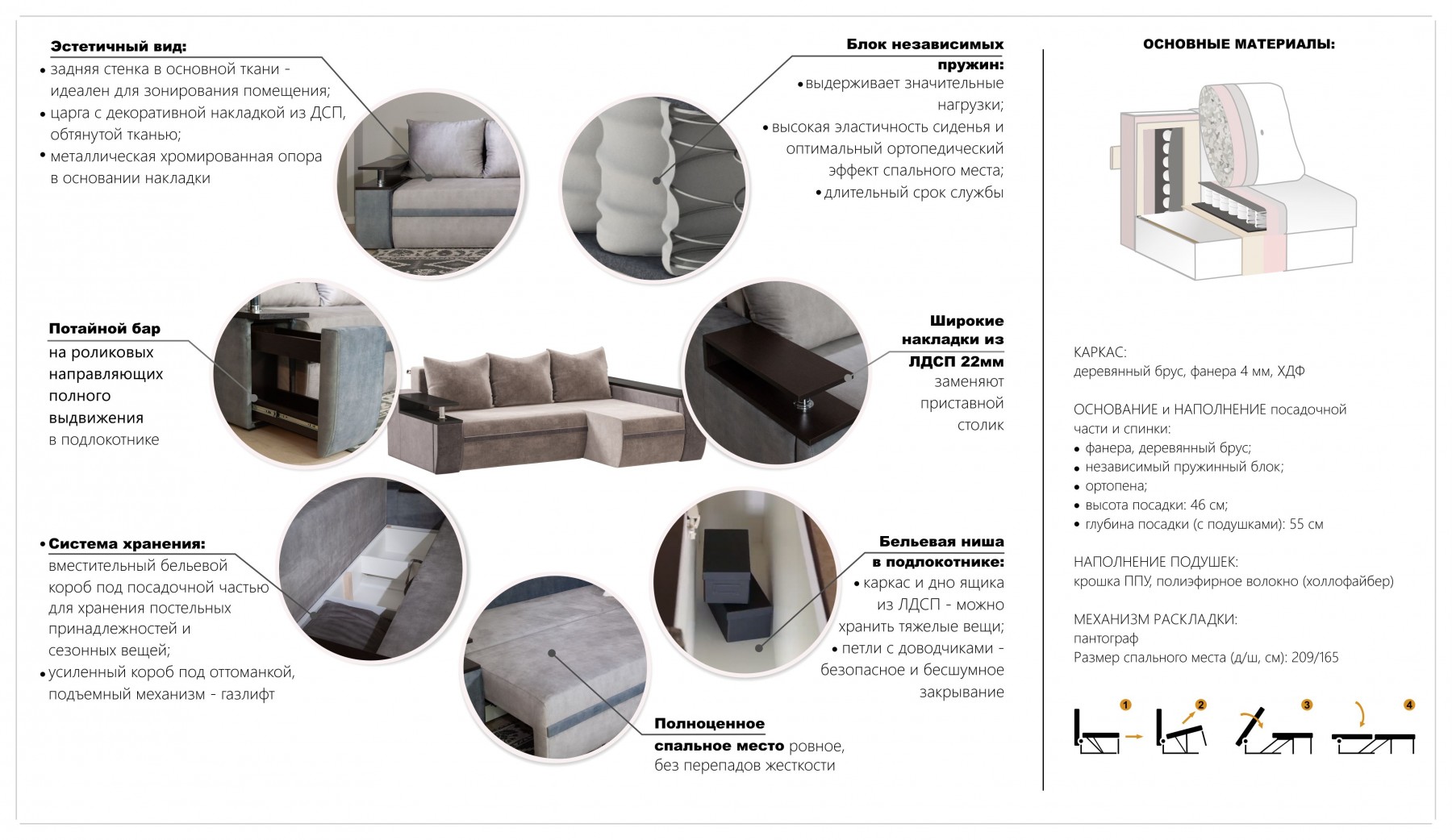 Наполнение: Независимый пружинный блок. Ткань: Велюр. Большие подушки под спину