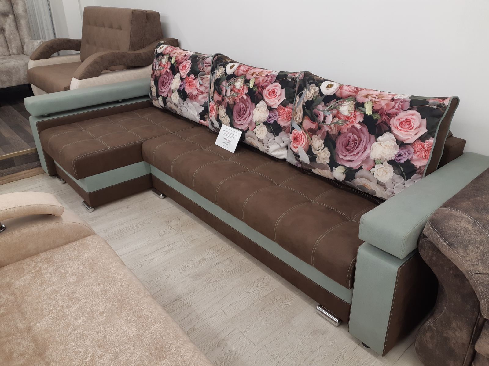 код 121522Коричневый цвет обивки. Яркие подушки.