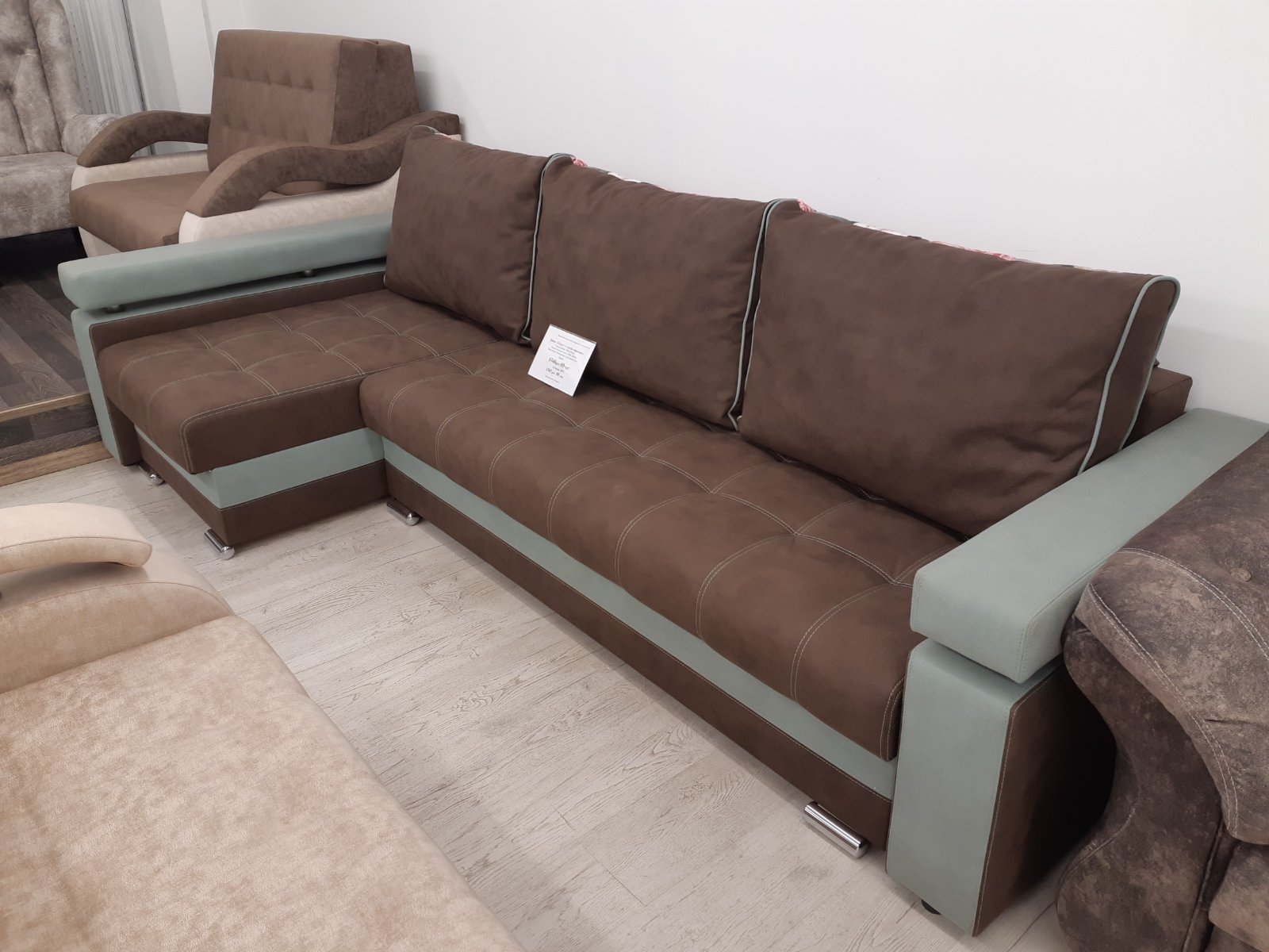 Подушки на угловой спинке и боковины украшены контрастной белой прострочкой.
