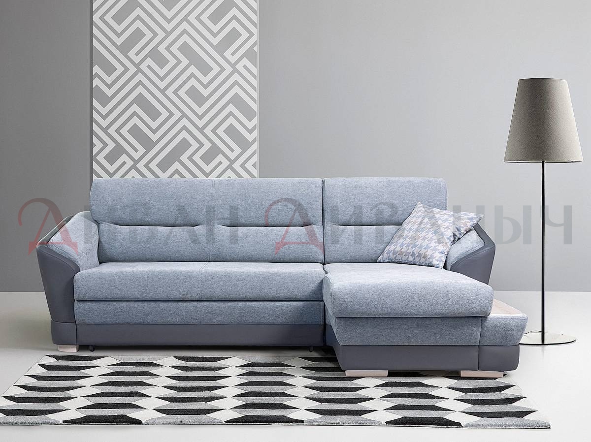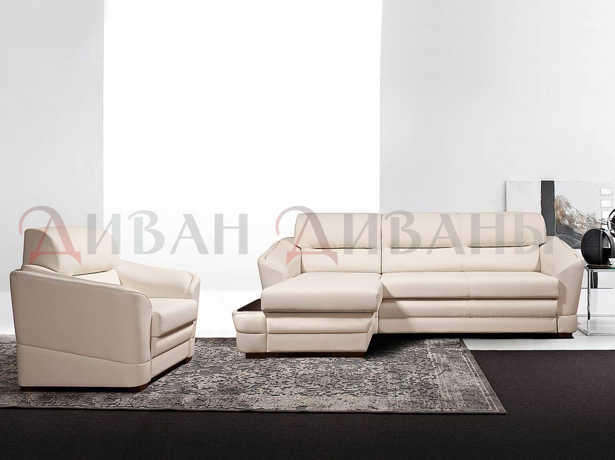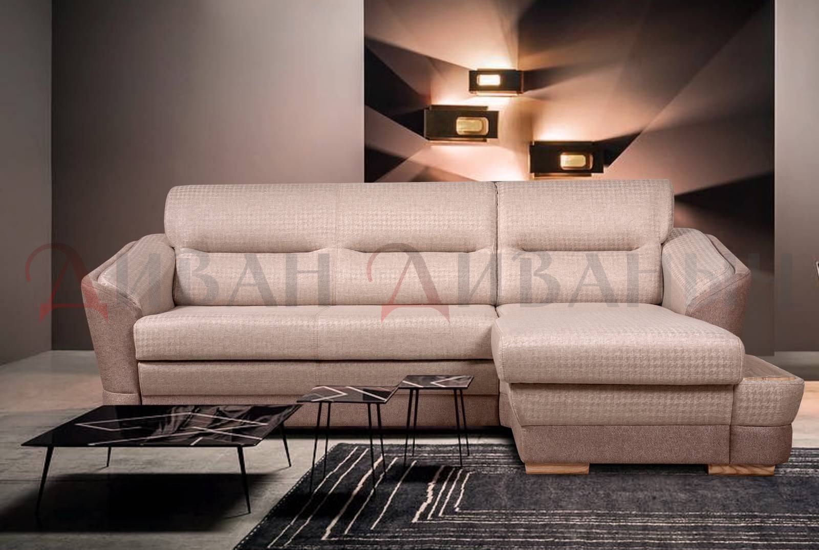 Современный стиль. Полки в боковинах и широкие подлокотники с деревянными вставками